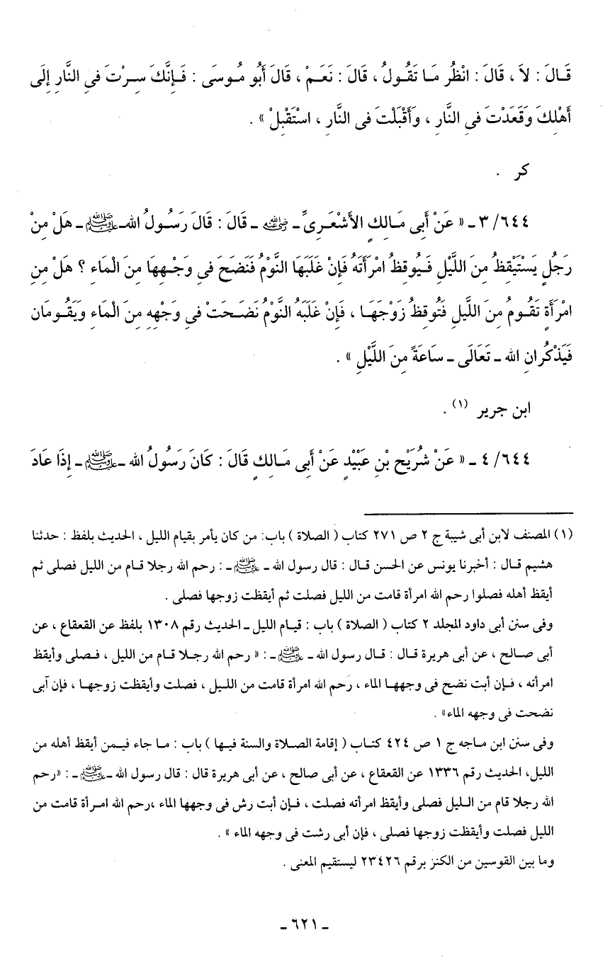 644/ 3 - "عَنْ أَبِى مَالِكٍ الأَشْعَرِىِّ - رضي الله عنه - قَالَ: قَالَ رَسُولُ الله - صلى الله عليه وسلم - هَلْ مِنْ رَجُلٍ يَسْتَيْقِظُ مِنَ اللَّيْلِ فَيُوقِظُ امْرَأَتَهُ فَإِنْ غَلَبَهَا النَّومُ فَنَضَحَ في وَجْهِهَا مِنَ الْمَاءِ؟ هَلْ مِنِ امْرَأَةٍ تَقُومُ مِنَ اللَّيلِ فَيُوقِظُ زَوْجَهَا، فَإِنْ غَلَبَهُ النَّوْمُ نَضَحَتْ في وَجْهِهِ مِنَ الْمَاءِ وَيَقُومَان فَيَذْكُرانِ الله -تَعَالَى- سَاعَةً مِنَ اللَّيْلِ".