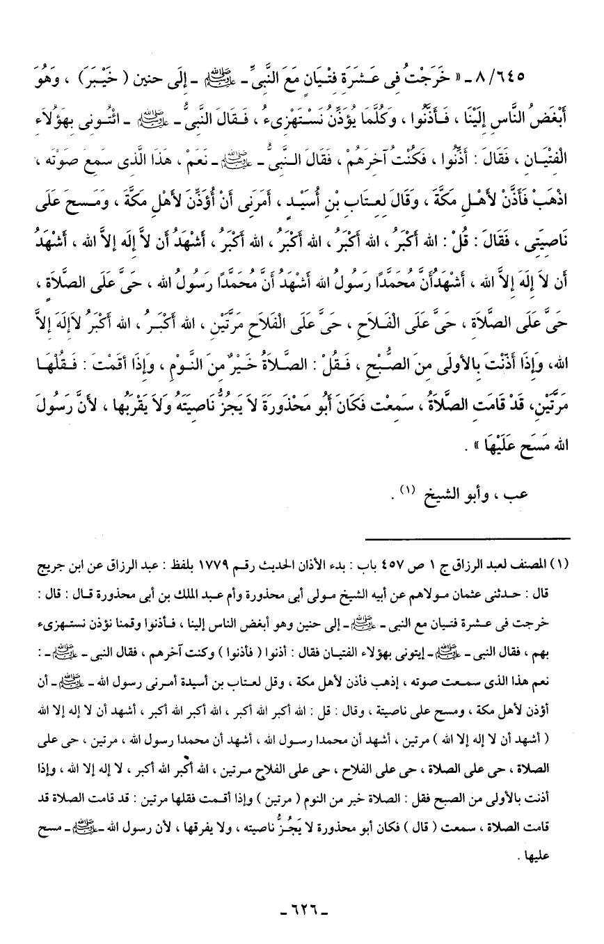 645/ 8 - "خَرَجْتُ في عَشَرَةِ فِتْيَانٍ مَعَ النَّبىِّ - صلى الله عليه وسلم - إِلَى حنين (خَيْبَرَ)، وَهُوَ أَبْغَضُ النَّاسِ إِلَيْنَا، فَأَذَّنُوا، وَكُلَّمَا يُؤَذِّنُ نَسْتَهْزِئُ، فَقَال النَّبِىُّ - صلى الله عليه وسلم - ائْتُونِى بِهَؤُلَاءِ الْفِتْيَانِ، فَقَالَ: أَذِّنُوا، فَكُنْتُ آخِرَهُمْ، فَقَالَ النَّبِىُّ - صلى الله عليه وسلم - نَعَمْ، هَذَا الَّذِى سَمِع صَوتَه، اذْهَبْ فَأَذَّنْ لأهْلِ مَكَّةَ، وَقَالَ لِعِتَابِ بْنِ أُسَيْدٍ، أَمَرَنِى أَنْ أُؤَذِّنَ لأهْلِ مَكَةَ، وَمَسحَ عَلَى نَاصِيَتِى، فَقَالَ: قُلْ: الله أكْبَرُ، الله أَكْبَرُ، الله أَكْبَرُ، الله أَكبَرُ، أشْهَدُ أَن لَّا إِلَه إلَّا الله، أَشْهَدُ أَن لَا إِلَهَ إلا الله، أَشْهَدُ أَنَّ مُحَمَّدًا رَسُولُ الله أَشْهَدُ أَنَّ مُحَمدًا رَسُولُ الله، حَىَّ عَلَى الصَّلَاةِ، حَىَّ عَلَى الصَّلَاةِ، حَىَّ عَلَى الْفَلَاحِ، حَىَّ عَلَى الْفَلَاحِ مَرَّتَيْنِ، الله أَكْبَرُ، الله أَكْبَرُ لَا إِلَهَ إلا الله، وإذَا أَذنْتَ بِالأولَى مِنَ الصُّبحِ، فَقُلْ: الصَّلَاةُ خَيْرٌ مِنَ النَّوْمِ، وَإِذَا أقَمْتَ: فَقُلْهَا مَرَّتيْنِ، قَدْ قَامَتِ الصَّلَاةُ، سَمِعْت فَكَانَ أبُو مَحْذَورَةَ لَا يَجُزُّ نَاصِيَتَهُ وَلَا يَقْرَبُها, لأنَّ رَسُولَ الله مَسَح عَلَيْهَا".
