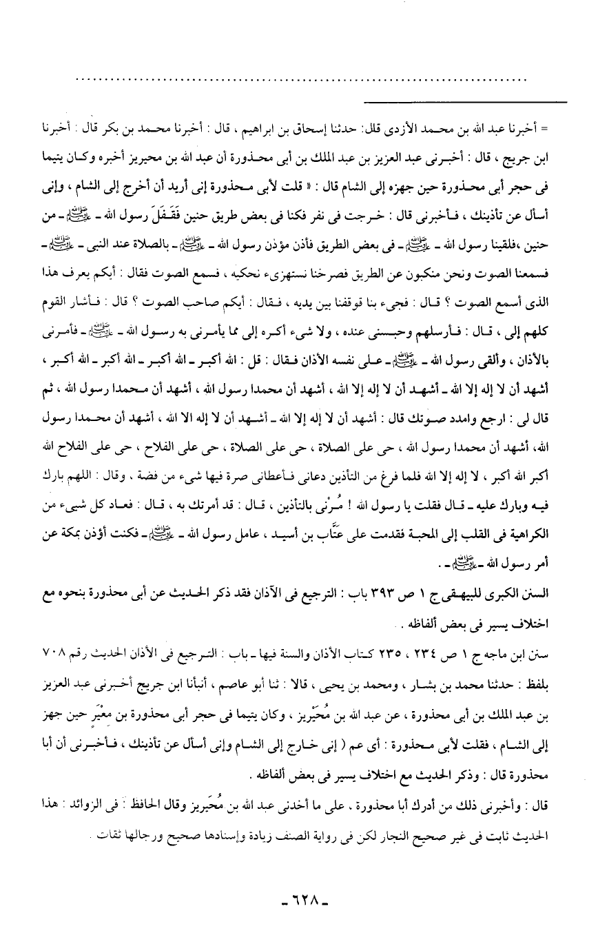 سنن ابن ماجه ج 1 ص 234، 235 كتاب الأذان والسنة فيها - باب: الترجيع في الأذان الحديث رقم 708 بلفظ: حدثنا محمَّد بن بشار، ومحمد بن يحيى، قالا: ثنا أبو عاصم، أنبأنا ابن جريج أخبرنى عبد العزيز بن عبد الملك بن أبى محذورة، عن عبد الله بن مُحَيْريز، وكان يتيما في حجر أبى محذورة بن معْيَرٍ حين جهز إلى الشام، فقلت لأبى محذورة: أى عم (إنى خارج إلى الشام وإنى أسأل عن تأذينك)، فأخبرنى أن أبا محذورة قال: وذكر الحديث مع اختلاف يسير في بعض ألفاظه.