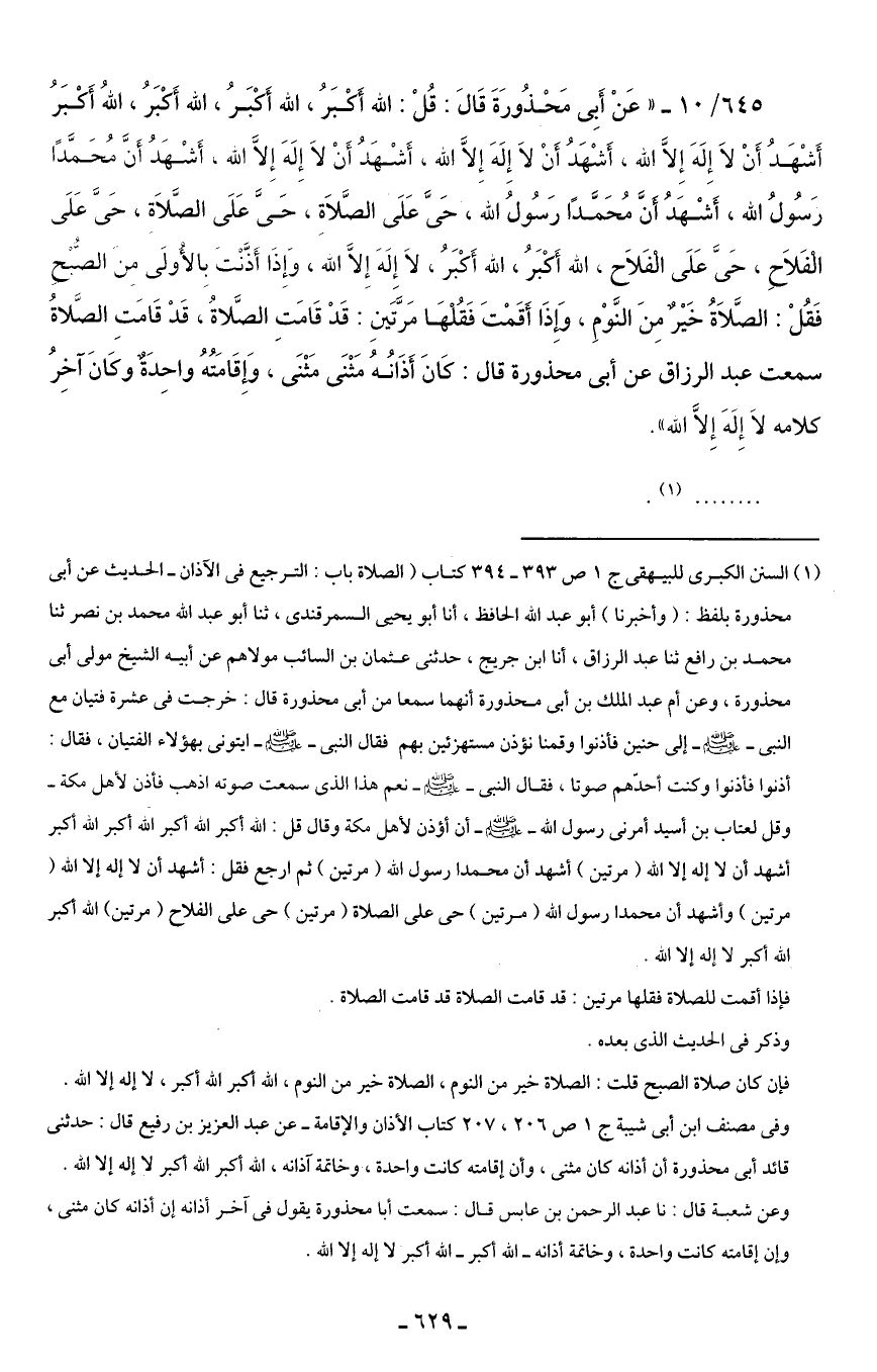 645/ 10 - "عَنْ أَبِى مَحْذُورَةَ قَالَ: قُلْ: الله أَكْبَرُ، الله أَكْبَرُ، الله أَكْبَرُ، اللهُ أَكْبَرُ أَشْهَدُ أَنْ لَا إِلَهَ إِلَّا الله، أَشْهَدُ أَنْ لَا إِلَهَ إِلَّا الله (*)، أَشْهَدُ أَنَّ مُحَمَّدًا رَسُولُ الله، أَشْهَدُ أنَّ مُحَمَّدًا رَسُولُ الله، حَىَّ عَلَى الصَّلَاةِ، حَىَّ عَلَى الصَّلَاة، حَىَّ عَلَى الْفَلَاحِ، حَىَّ عَلَى الْفَلَاح، الله أَكْبَرُ، الله أَكْبَرُ، لَا إِلَهَ إِلَّا الله، وَإِذَا أَذَّنتَ بِالأولَى من الصُّبْحِ فَقُلْ: الصَّلَاةُ خَيْرٌ مِنَ النَّوْمِ، وَإذَا أَقَمْتَ فَقُلْهَا مَرَّتَينِ: قَدْ قَامَتِ الصَّلاة، قَدْ قَامَتِ الصَّلاةُ سمعت عبد الرزاق عن أبى محذورة قال: كَانَ أَذَانُهُ مَثْنَى مَثْنَى، وَإِقَامَتُهُ واحِدَةٌ وكَانَ آخِرُ كلامه لَا إِلَهَ إِلَّا الله".