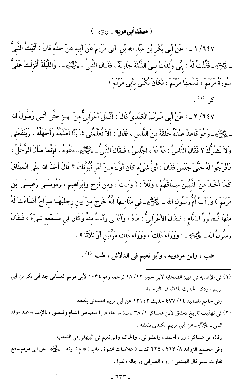 647/ 1 - " عَنْ أَبِى بَكْرِ بْنِ عَبْدِ الله بْنِ أبى مَرْيَمَ عَنْ أَبِيهِ عَنْ جَدِّهِ قَالَ: أَتَيْتُ النَّبِىَّ - صلى الله عليه وسلم - فَقُلتُ لَهُ: إِنِّى وُلِدَتْ لىَ اللَّيْلَةَ جَاريَةٌ، فَقَالَ النَّبىُّ - صلى الله عليه وسلم -، وَاللَّيْلَةَ أُنْزلَتْ عَلَىَّ سُورَةُ مَرْيَمَ، فَسِّمهَا مَرْيَمَ، فَكَانَ يُكْنَى بِأَبِى مَرْيَمَ".