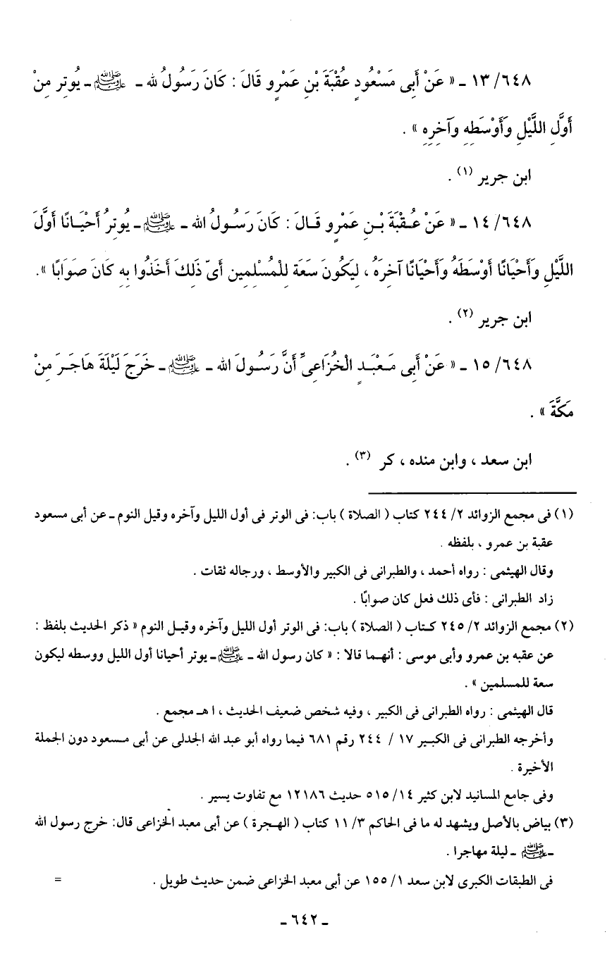 648/ 14 - "عَنْ عقْبَةَ بْنِ عَمْرٍو قَالَ: كانَ رَسُولُ الله - صلى الله عليه وسلم - يُوتِرُ أَحْيَانًا أَوَّلَ اللَّيْلِ وَأَحْيَانًا أَوْسَطَهُ وَأَحْيَانًا آخِرَهُ، لِيَكُونَ سَعَة لِلْمُسْلِمِين أَى ذَلِكَ أَخَذُوا بِهِ كانَ صَوَابًا".