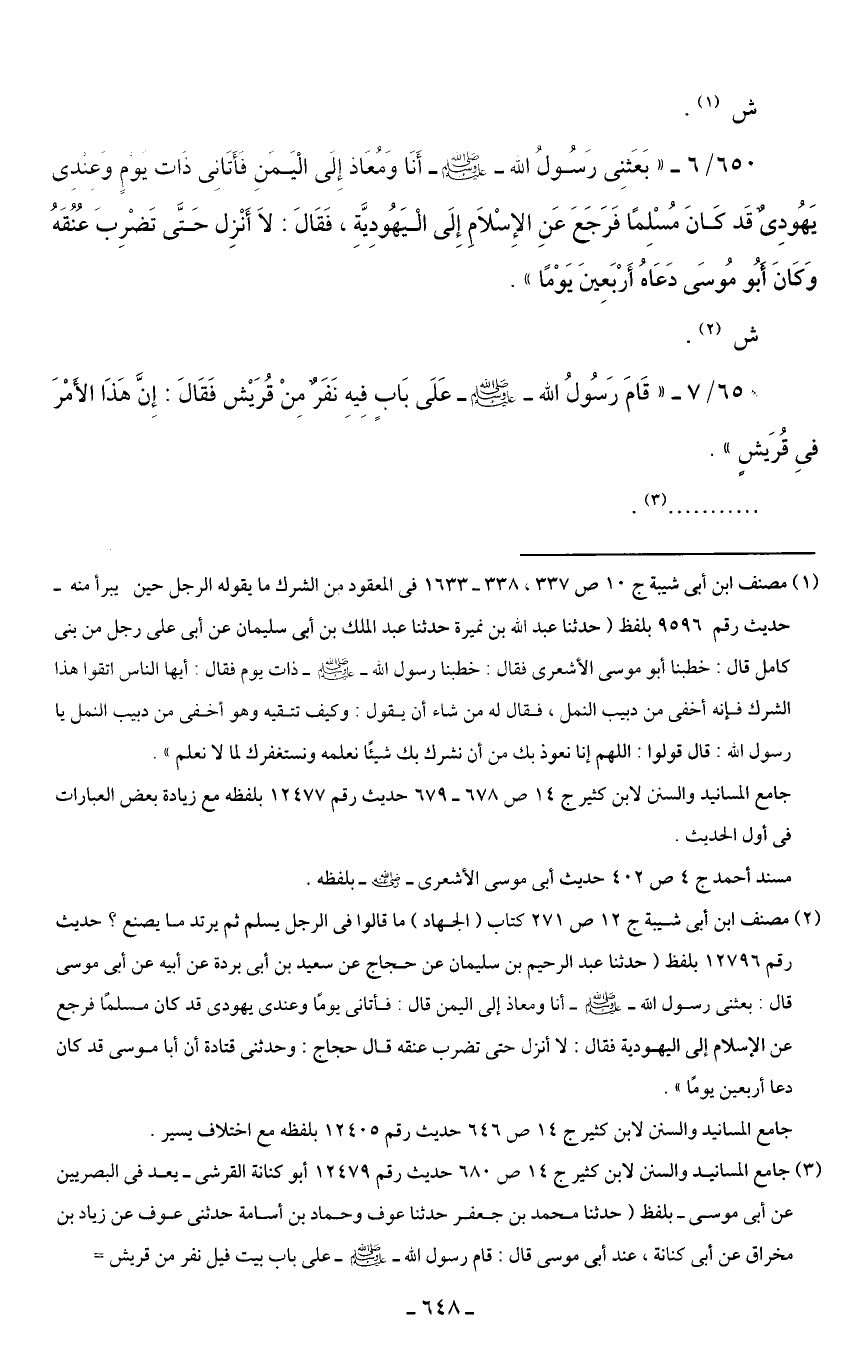 650/ 6 - "بَعَثنِى رَسُول الله - صلى الله عليه وسلم - أَنَا وَمُعَاذ إِلى الْيَمَنِ فأَتَانِى ذات يومٍ وَعِندِى يَهُودِىٌ قَد كَانَ مُسْلِمًا فَرَجَعَ عَنِ الإِسْلَامِ إِلَى الْيَهُودِيَّةِ، فَقَالَ: لَا أَنْزِل حَتَى تَضْرِبَ عُنُقَهُ وَكَانَ أَبُو مُوسَى دَعَاهُ أَرْبَعِينَ يَوْمًا".