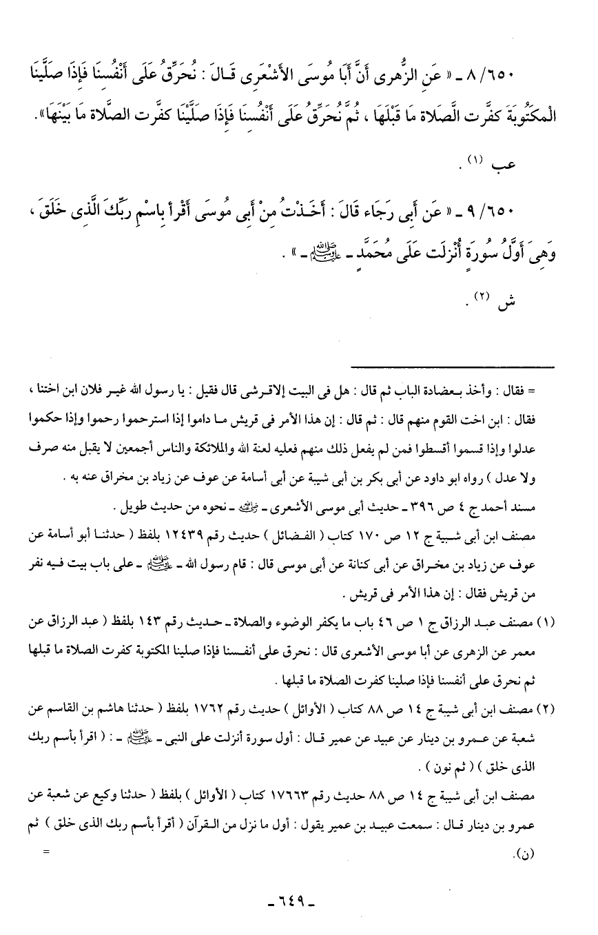 650/ 9 - "عَن أَبِى رَجَاء قَالَ: أَخَذْتُ مِنْ أَبِى مُوسَى اقْرأ بِاسْم ربِّكَ الَّذِى خَلَقَ، وَهِىَ أَوَّلُ سُورَةٍ أنزلَت عَلَى مُحَمَّدٍ - صلى الله عليه وسلم -".