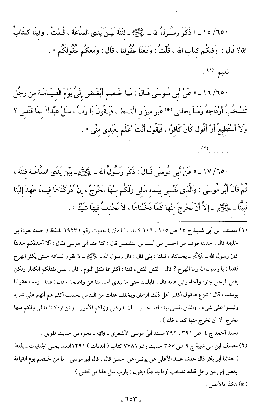 650/ 17 - "عَنْ أَبِى مُوسَى قَالَ: ذَكَر رَسُولُ الله - صلى الله عليه وسلم - بَيْنَ يَدَى السَّاعَة فِتْنَة، ثُمَّ قَالَ أبُو مُوسَى: وَالَّذِى نَفْسِى بِيَدهِ مَا لِى وَلَكُم مِنْهَا مَخْرجٌ، إِنْ أَدْرَكْنَاهَا فِيمَا عَهِدَ إِلَيْنَا نَبِيُّنَا - صلى الله عليه وسلم - إلَّا أَنْ نَخْرجَ مِنْها كَمَا دَخَلْنَاهَا، لَا نَحْدِثُ فِيهَا شَيْئًا".