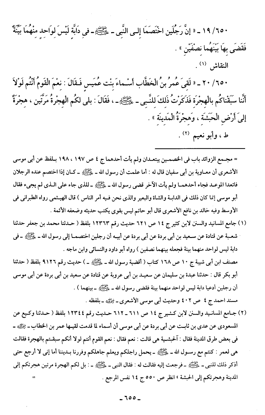 650/ 20 - "لَقِىَ عُمرُ بنُ الْخَطَّاب أَسْماءَ بِنْت عُمَيسٍ فَقَالَ: نِعْمَ القَومُ أَنْتُم لَوْلَا أَنَّنا سَبَقْناكُم بالْهِجْرَةِ فَذَكَرْتُ ذَلِكَ لِلنَّبِى - صلى الله عليه وسلم -، فَقَالَ: بلى لكُم الهِجْرةُ مَرَّتَين، هِجْرَةٌ إلىَ أَرْضِ الحَبَشَةِ، وَهِجْرَةُ المَدِينَةِ".
