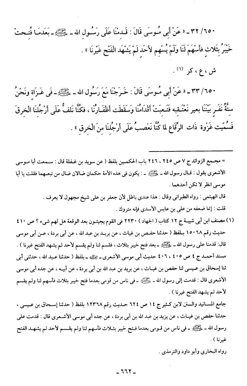 650/ 32 - "عَنْ أَبِى مُوسَى قَالَ: قَدِمْنَا عَلَى رَسُولِ الله - صلى الله عليه وسلم - بَعَدمَا فُتِحتْ خَيْبَرُ بِثَلاثٍ فأَسْهَمَ لَنَا وَلَمْ يُسْهِم لأحَدٍ لَمْ يَشْهَد الفَتْح غَيْرنَا".
