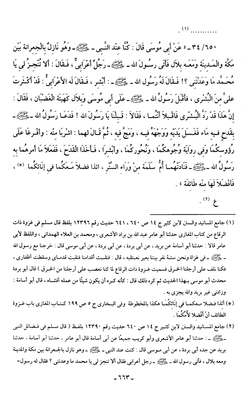 650/ 34 - "عَنْ أَبِى مُوسَى قَالَ: كُنَّا عِنْد النَّبِى - صلى الله عليه وسلم - وَهُو نَازِلٌ بِالْجِعِرانة بَيْن مَكَّة والْمَدِينَةِ وَمَعَه بِلَال فَأَتَى رسُولَ الله - صلى الله عليه وسلم - رَجُلٌ أَعْرَابِىٌّ، فَقَالَ: أَلا تُنْجِزُ لىِ يَا مُحَمَّد مَا وَعَدْتَنِى؟ ! فَقَالَ لَهُ رَسُول الله - صلى الله عليه وسلم -: أَبْشِر، فَقَالَ لَه الأَعرَابِيُّ: قَدْ أَكْثَرتَ علىَّ مِنَ البُشْرى، فأَقْبَلَ رَسُولُ الله - صلى الله عليه وسلم - عَلَى أَبِى مُوسَى وَبِلَال كَهَيئَة الغَضْبَان، فَقَالَ: إِنَّ هَذَا قَدْ رَدَّ الْبُشْرى فَاقْبلَا أَنْتُما، فَقَالَا: قَبِلنَا يَا رَسُولَ الله! فَدَعَا رَسُولُ الله - صلى الله عليه وسلم - بِقَدحٍ فيهِ مَاء فَغَسَلَ يَدَيْهِ وَوَجْهَهُ فِيه، وَمَجَّ فِيهِ، ثُمَّ قَالَ لهما: اشْربَا مِنْه: وأفْرغَا عَلَى رُؤوسِكُما وَفِي رِوَايَة وجُوهكُمَا، وَنُحُوركُمَا، وأبْشِرَا، فَأَخَذَا الْقَدَحَ، فَفَعَلَا مَا أَمرهُما بِهِ رَسُولُ الله - صلى الله عليه وسلم - فَنَادَتْهُما أُمُّ سَلَمَة مِنْ وَرَاءِ السِّتْرِ، ائذا فضلَا مَعَكُما في إنَائِكُما (*)، فَأفْضَلَا لَهَا مِنْه طَائِفَة".