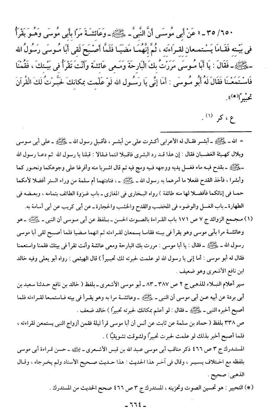 650/ 35 - "عَنْ أَبِى مُوسَى أَنَّ النَّبِىَّ - صلى الله عليه وسلم - وَعَائِشَةَ مَرًا بِأَبِى مُوسَى وَهُوَ يَقْرَأُ في بَيْتِهِ فَقَامَا يَسْتمعانِ لِقِرَاءَتِهِ، ثُمَّ إِنَّهُمَا مَضَيَا فَلَمَّا أَصْبَحَ لَقِى أَبَا مُوسَى رَسُولُ الله - صلى الله عليه وسلم - فَقَالَ: يَا أَبَا مُوسَى مَرَرْتُ بِكَ الْبَارِحَةَ وَمَعِى عَائشَة وَأَنْتَ تَقْرَأُ فِى بَيْتِكَ، فَقُمْنَا فَاسْتَمَعْنَا فَقَالَ لَهُ أَبُو مُوسَى: أَمَا إنِّى يَا رَسُول الله لَوْ عَلْمِت بمكانِكَ لحَبَّرْتُ لَكَ الْقُرآنَ تحبْيرًا (*) ".