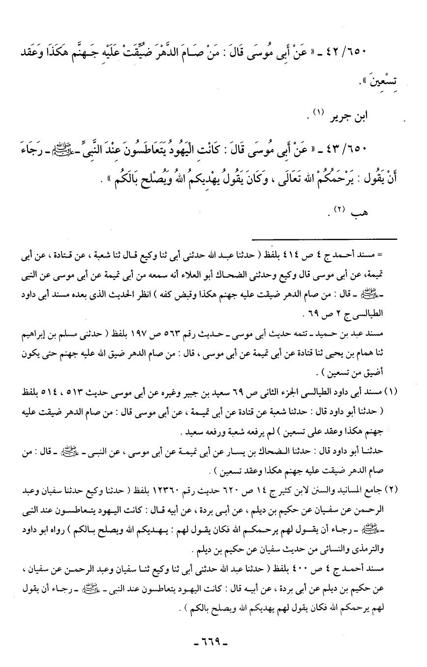 650/ 42 - "عَنْ أَبِى مُوسَى قَالَ: مَنْ صَامَ الدَّهْرَ ضُيِّقَتْ عَلَيْهِ جَهنَّم هَكَذَا وَعَقد تِسْعِينَ".
