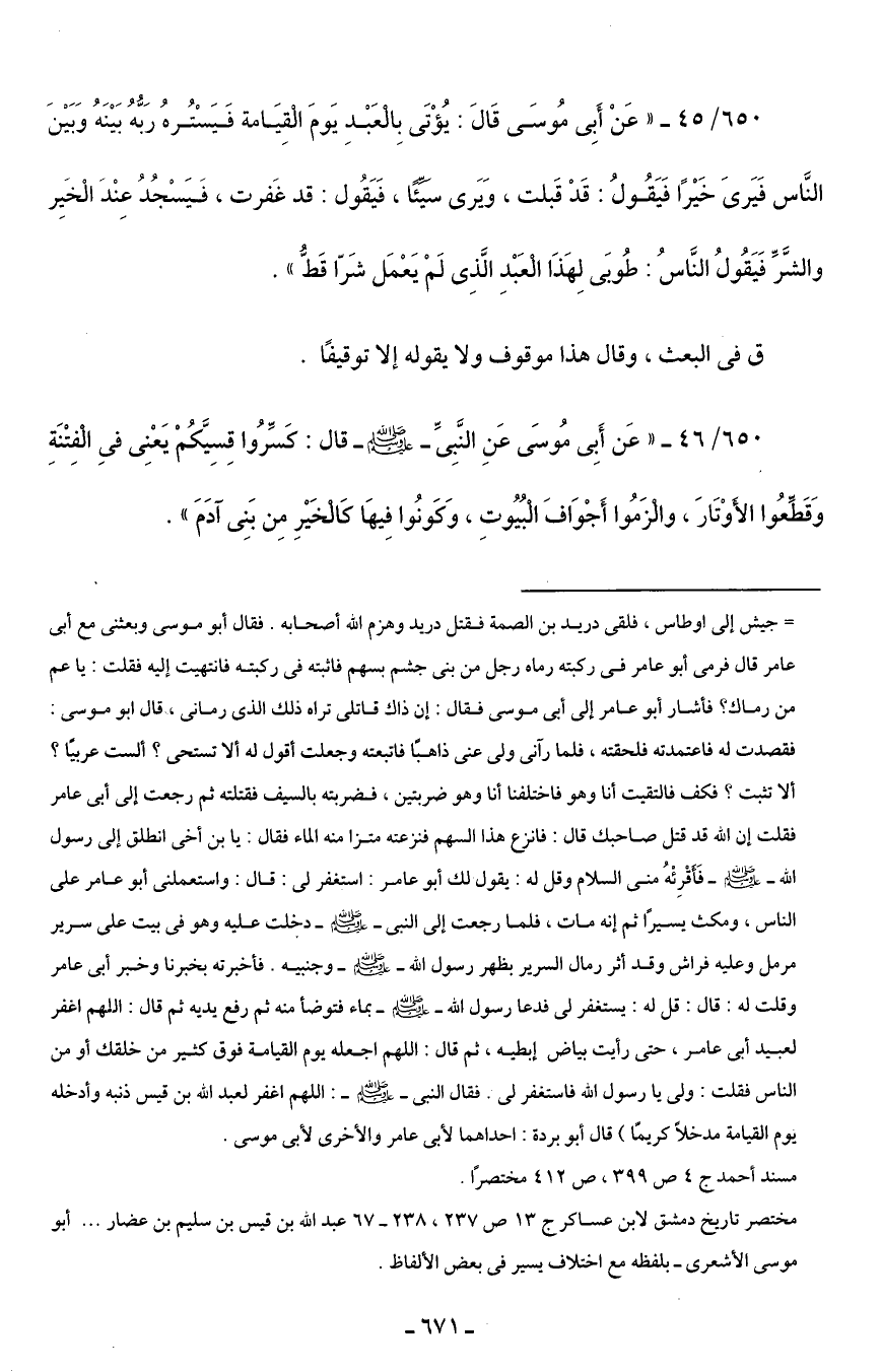 650/ 46 - "عَن أَبِى مُوسَى عَنِ النَّبِىِّ - صلى الله عليه وسلم - قال: كَسِّرُوا قِسِيَّكُمْ يَعْنِى في الْفِتْنَةِ وَقَطِّعُوا الأَوْتَارَ، والْزَمُوا أَجْوَافَ الْبُيُوتِ، وَكَونُوا فِيهَا كَالْخَيْرِ مِن بَنِى آدَمَ".