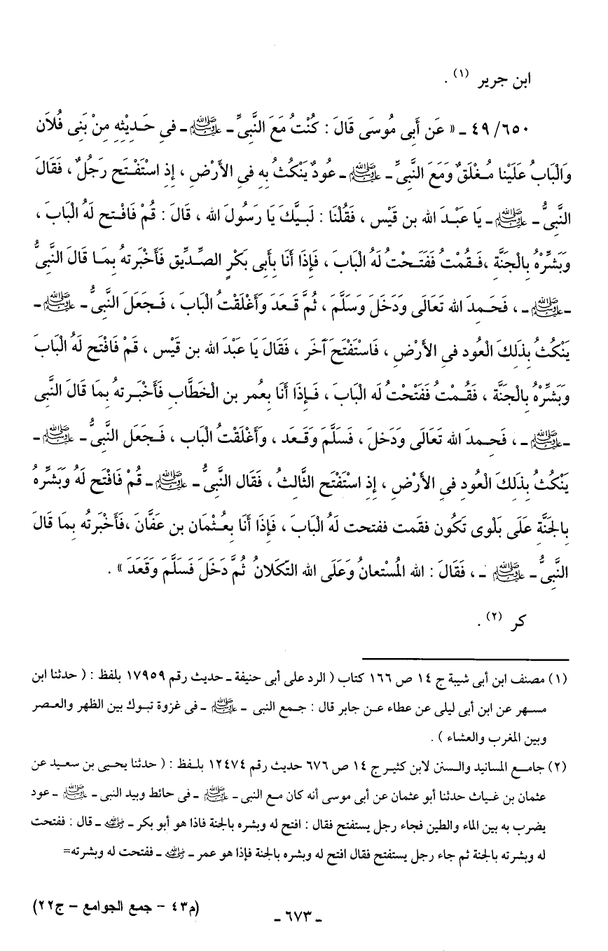 (¬2) جامع المسانيد والسنن لابن كثير ج 14 ص 676 حديث رقم 12474 بلفظ: (حدثنا يحيى بن سعيد عن عثمان بن غياث حدثنا أبو عثمان عن أبي موسى أنه كان مع النبي - صلى الله عليه وسلم - في حائط وبيد النبي - صلى الله عليه وسلم - عود يضرب به بين الماء والطين فجاء رجل يستفتح فقال: افتح له وبشره بالجنة فإذا هو أبو بكر - رضي الله عنه - قال: ففتحت له وبشرته بالجنة ثم جاء رجل يستفتح فقال افتح له وبشره بالجنة فإذا هو عمر - رضي الله عنه - ففتحت له وبشرته =