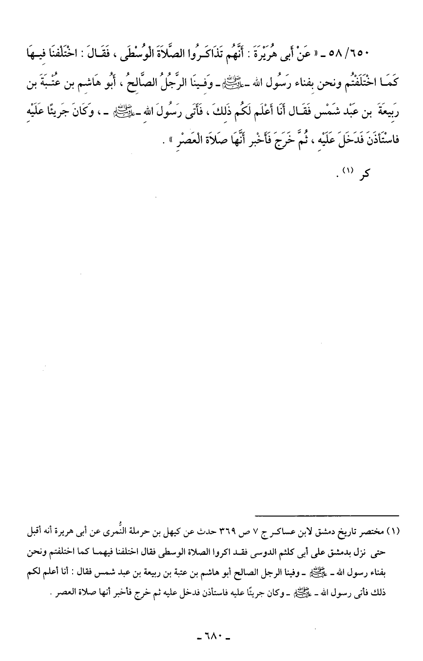 650/ 58 - "عَنْ أَبى هُرَيْرَةَ: أَنَّهُم تَذَاكَرُوا الصَّلَاةَ الْوُسْطَى، فَقَالَ: اخْتَلْفنَا فِيهَا كَمَا اخْتَلَفْتُم ونحن بِفناء رَسُول الله - صلى الله عليه وسلم - وَفِينَا الرَّجُلُ الصَّالِحُ، أَبُو هَاشِم بن عُتْبَةَ بن رَبِيعَةَ بن عَبْد شَمْس فَقَال أَنَا أَعْلَم لَكُم ذَلِكَ، فَأَتَى رَسُولَ اللهِ - صلى الله عليه وسلم -، وَكَانَ جَريئًا عَلَيْهِ فاسْتَأذَنَ فَدَخَلَ عَلَيْهِ، ثُمَّ خَرَجَ فَأَخْبر أَنَّهَا صَلَاة الْعَصْرِ".