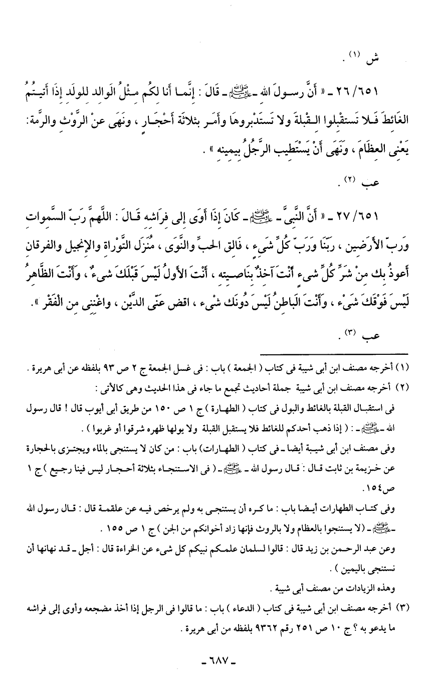 651/ 26 - "أَنَّ رسولَ اللهِ - صلى الله عليه وسلم - قَالَ: إِنَّما أَنا لِكُم مِثْلُ الَوالِد لِلولَدِ إِذَا أَتيتُمُ الغَائِطَ فَلا تَستقْبِلوا الِقْبلةَ ولا تَستَدْبروهَا وأَمَر بثلاثَة أَحْجَارٍ، ونَهَى عنْ الرَّوْثِ والرَّمة: يَعْنِى العِظَامَ، وَنَهَى أَنْ يَسْتَطِيب الرَّجُلُ بِيمِينهِ".