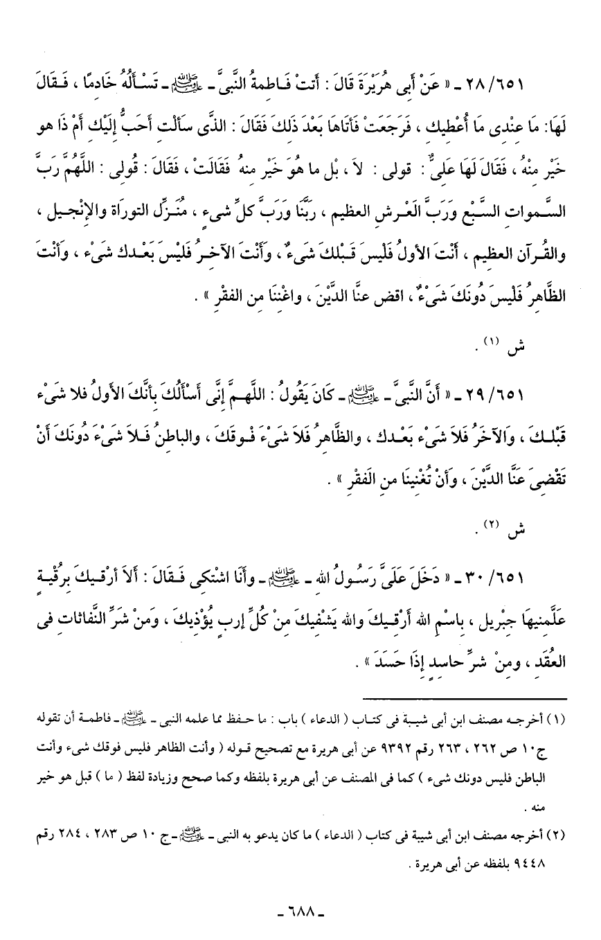 651/ 28 - "عَنْ أَبِى هُرَيْرَةَ قَالَ: أَتتْ فَاطِمةُ النَّبىَّ - صلى الله عليه وسلم - تَسْأَلُهُ خَادِمًا، فَقَالَ لَهَا: مَا عِنْدِى مَا أُعْطِيكِ، فَرَجَعَتْ فَأتَاهَا بَعْدَ ذَلِكَ فَقَالَ: الذَّى سَألْتِ أَحَبُّ إِلَيْكِ أَمْ ذَا هو خَيْر مِنْهُ، فَقَالَ لَهَا عَلِىٌّ: قولى: لَا، بْل ما هُوَ خَيْر مِنهُ فَقَالَتْ، فَقَالَ: قُولِى: اللَّهُمَّ رَبَّ السَّمواتِ السَّبْع وَرَبَّ الَعْرشِ العظيم، رَبَّنَا وَرَبَّ كلِّ شئٍ، مُنَزِّل التورَاة والإِنْجيل، والقُرَآن العظِيم، أَنْتَ الأولُ فَليسَ قَبْلكَ شَئٌ، وَأَنْتَ الآخِرُ فَليْسَ بَعْدك شَىْء، وَأنْتَ الظَّاهِرُ فَليسَ دُونَكَ شَىْءٌ، اقض عنَّا الدَّيْنَ، واغْنِنَا مِن الفقْرِ".