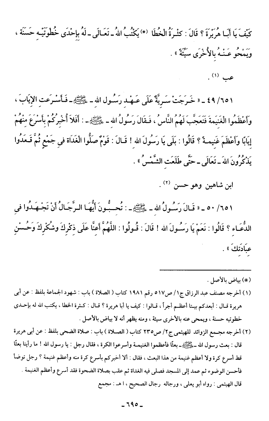 651/ 49 - "خَرَجَتْ سَرِيَّةٌ عَلَى عَهْدِ رَسُول اللهِ - صلى الله عليه وسلم - فَأسْرَعتِ الإِيَابَ، وَأَعْظَمُوا الْغَنِيَمةَ فَتَعَجَّبَ لَهُمُ النَّاسُ، فَقَالَ رَسُولُ اللهِ - صلى الله عليه وسلم -: أَفَلَا أُخْبِرُكُمْ بِأَسْرَعَ مِنْهُمْ إِيَابًا وَأَعْظَمَ غَنِيمةً؟ قَالُوا: بَلَى يَا رَسُولَ اللهِ! قَالَ: قَوْمٌ صَلُّوا الْغَدَاة في جَمْعٍ ثُمَّ قَعَدُوا يَذْكُرُونَ اللهَ -تَعَالَى- حَتَّى طَلَعَتِ الشَّمْسُ".