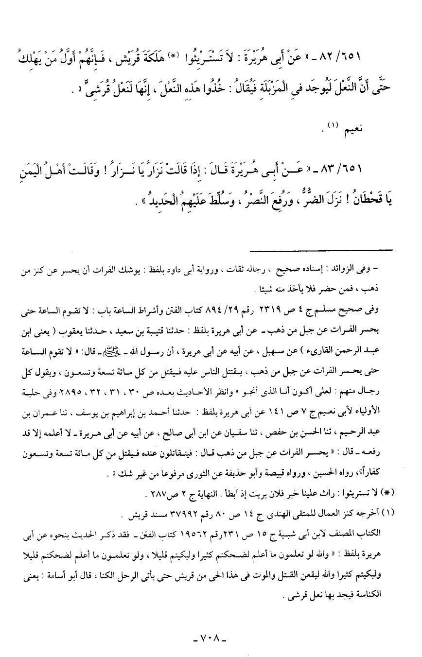 651/ 82 - "عَنْ أَبِى هُرَيْرَةَ: لَا تَسْتَرْيِثُوا (*) هَلَكَةَ قُرَيْش، فَإِنَّهُمْ أَوَّلُ مَنْ يَهْلِكُ حَتَّى أَنَّ النَّعْلَ لَيُوجَد في الْمَزْبَلَةِ فَيُقَالُ: خُذُوا هَذِهِ النَّعْلَ، إِنَّهَا لَنَعْلُ قُرَشِيٍّ".