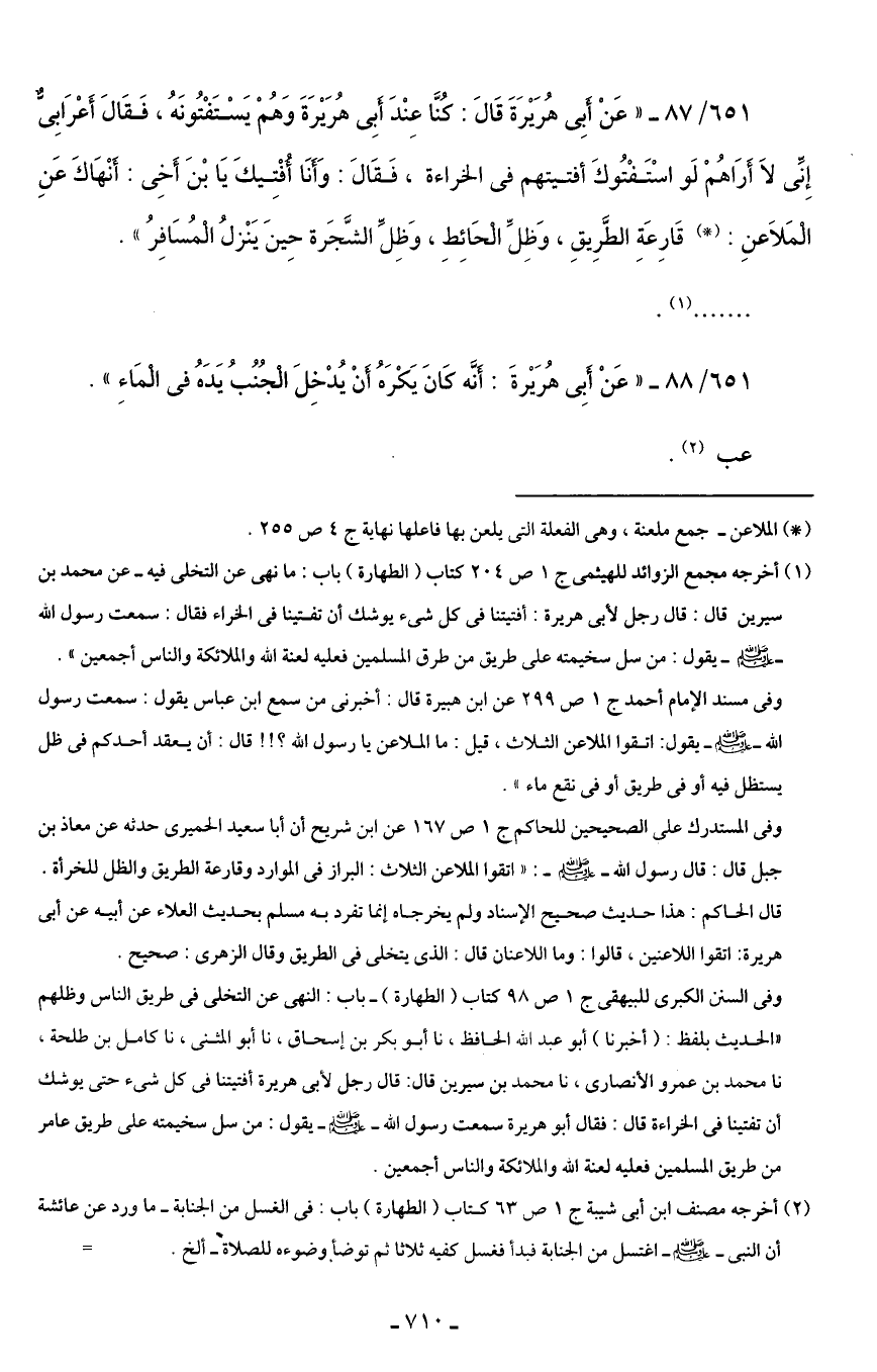 651/ 87 - "عَنْ أَبِي هُرَيْرَةَ قَالَ: كُنَّا عِنْدَ أَبِي هُرَيْرَةَ وَهُمْ يَسْتَفْتُونَهُ، فَقَالَ أَعْرَابِيٌّ إِنِّي لَا أَرَاهُمْ لَو اسْتَفْتُوكَ أفتيتهم في الخراءة، فَقَالَ: وَأَنَا أُفْتِيكَ يَا بْنَ أَخِى: أَنْهَاكَ عَنِ الْمَلَاعنِ: (*) قَارِعَةِ الطَّرِيقِ، وَظِلِّ الْحَائِطِ، وَظِلِّ الشَّجَرة حِينَ يَنْزلُ الْمُسَافِرُ".