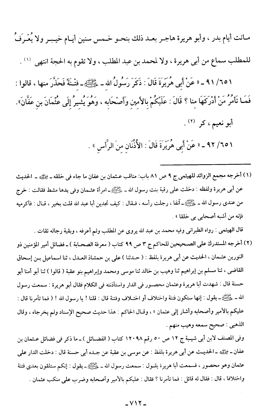 651/ 91 - "عَنْ أَبِى هُرَيْرَةَ قَالَ: ذَكَرَ رَسُولُ اللهِ - صلى الله عليه وسلم - فِتْنَةً فَحَذَّرَ منها، قالوا: فَمَا تَأمُرُ مَنْ أَدْرَكَهَا مِنا؟ قَالَ: عَلَيْكُمْ بِالأَمِينِ وَأَصْحَابِه، وَهُوَ يُشِيرُ إِلَى عُثْمَانَ بنِ عَفَّانَ".