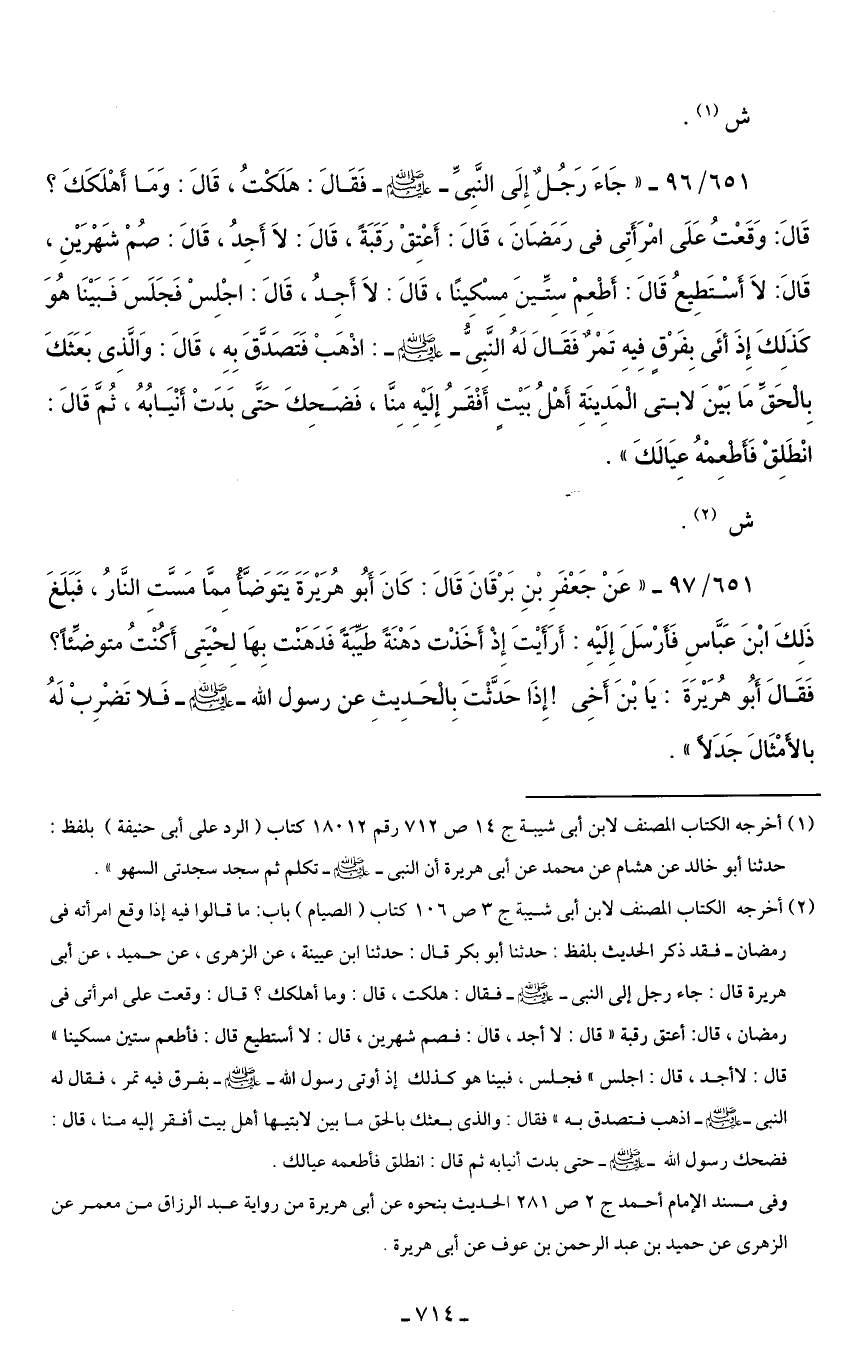 651/ 96 - "جَاءَ رَجُلٌ إِلَى النَّبِيِّ - صلى الله عليه وسلم - فَقَالَ: هَلَكْتُ، قَالَ: وَمَا أَهْلَكَكَ؟ قَالَ: وَقَعْتُ عَلَى امْرَأَتِي في رَمَضَانَ، قَالَ: أَعْتِقْ رَقَبَةً، قَالَ: لَا أَجِدُ، قَالَ: صُمْ شَهْرَيْنِ، قَالَ: لَا أَسْتَطِيعُ قَالَ: أَطْعِمْ سِتِّينَ مِسْكينًا، قَالَ: لَا أَجِدُ، قَالَ: اجْلِسْ فَجَلَسَ فَبَيْنَا هُوَ كَذَلِكَ إِذَ أئَي بِفَرْق فِيهِ تَمْرٌ فَقَالَ لَهُ النَّبِىُّ - صلى الله عليه وسلم -: اذْهَبْ فَتَصَدَّقَ بِهِ، قَالَ: وَالَّذِي بَعَثَكَ بِالْحَقِّ مَا بَيْنَ لابتى الْمَدِينَةِ أَهْلُ بَيْت أَفْقَرُ إِلَيْهِ مِنَّا، فَضَحِكَ حَتَّى بَدَتْ أَنْيَابُهُ، ثُمَّ قَالَ: انْطَلِقْ فَأَطْعِمْهُ عِيَالَكَ".