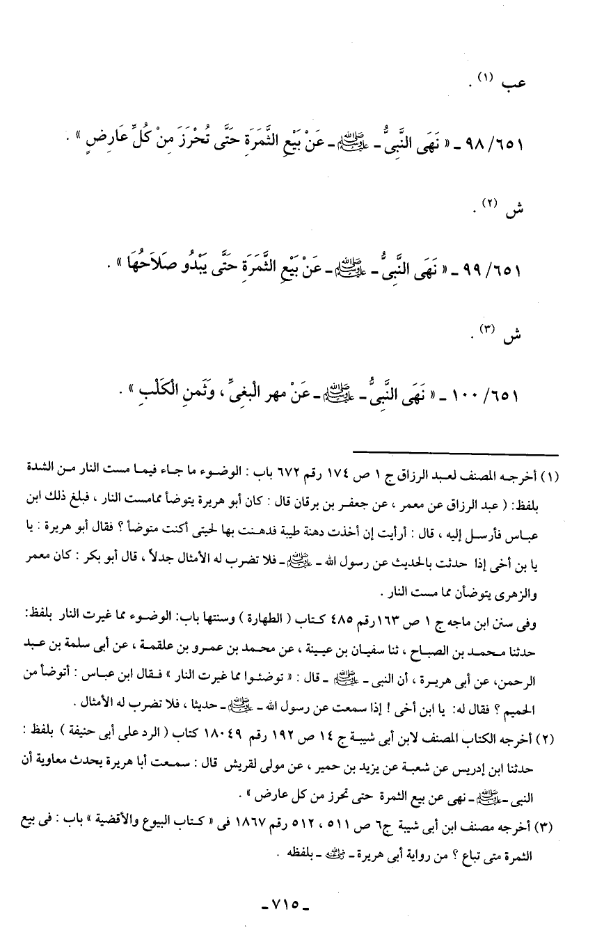 651/ 98 - "نَهَى النَّبِيُّ - صلى الله عليه وسلم - عَنْ بَيْعِ الثَّمَرَةِ حَتَّى تُحْرَزَ مِنْ كُلِّ عَارِضٍ".