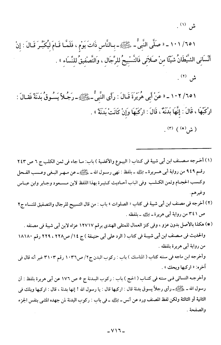 651/ 102 - "عَنْ أَبِى هُرَيْرَةَ قَالَ: رَأَى النَّبِيُّ - صلى الله عليه وسلم - رَجُلًا يَسُوقُ بَدَنَةً فَقالَ: ارْكَبْهَا، قَالَ: إِنَّهَا بَدَنَةٌ، قَالَ: ارْكَبْهَا وَإِنْ كَانَتْ بَدَنَةً".