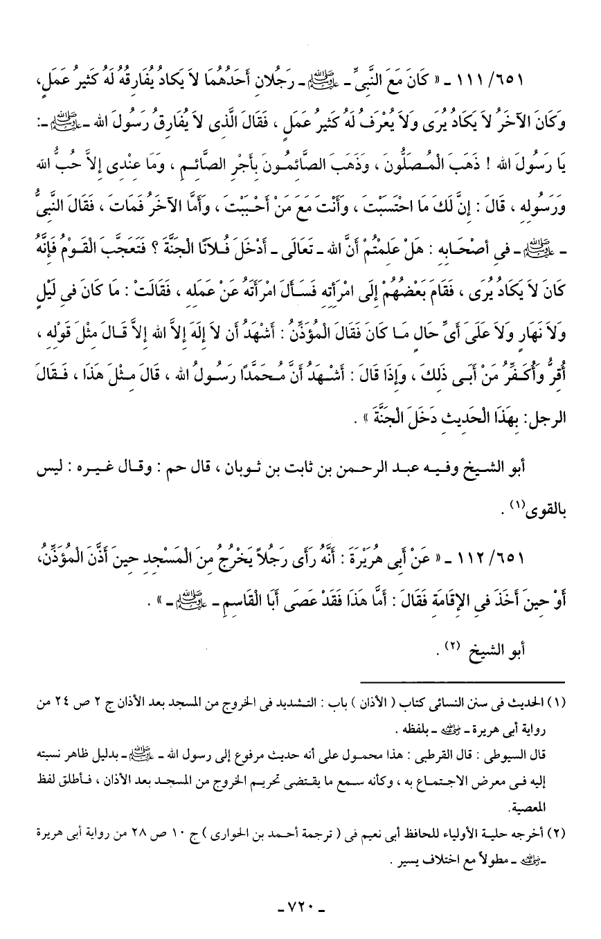 651/ 111 - "كَانَ مَعَ النَّبِيِّ - صلى الله عليه وسلم - رَجُلانِ أَحَدُهُمَا لَا يَكادُ يُفَارِقُهُ لَهُ كَثيرُ عَمَلٍ، وَكَانَ الآخَرُ لَا يَكَادُ يُرَى وَلَا يُعْرَفُ لَهُ كَثيرُ عَمَلٍ، فَقَالَ الَّذِى لَا يُفَارِقُ رَسُولَ الله - صلى الله عليه وسلم -: يَا رَسُولَ الله! ذَهَبَ الْمُصَلُّونَ، وَذَهَبَ الصَّائِمُونَ بِأَجْرِ الصَّائِم، وَمَا عِنْدِى إِلَّا حُبُّ الله وَرَسُولِهِ، قَالَ: إِنَّ لَكَ مَا احْتَسَبْتَ، وَأَنْتَ مَعَ مَنْ أَحْبَبْتَ، وَأَمَّا الآخَرُ فَمَاتَ، فَقَالَ النَّبِيُّ - صلى الله عليه وسلم - فيِ أصْحَابِهِ: هَلْ عَلِمْتُمْ أَنَّ الله -تَعَالَى- أَدْخَلَ فُلانًا الْجَنَّةَ؟ فَتَعَجَّبَ الْقَوْمُ فَإِنَّهُ كَانَ لَا يَكَادُ يُرَى، فَقَامَ بَعْضُهُمْ إِلَى امْرَأِتِهِ فَسَأَلَ امْرَأَتَهُ عَنْ عَمَلِهِ، فَقَالَتْ: مَا كَانَ في لَيْلٍ وَلَا نَهَارٍ وَلَا عَلَىَ أَيِّ حَالٍ مَا كَانَ فَقَالَ الْمُؤَذِّنُ: أَشْهَدُ أَن لَا إِلَهَ إِلَّا الله إِلَّا قَالَ مِثْلَ قَوْلِهِ، أُقِرُّ وَأُكَفِّرُ مَنْ أَبَى ذَلِكَ، وَإِذَا قَالَ: أَشْهَدُ أَنَّ مُحَمَّدًا رَسُولُ الله، قَالَ مِثْلَ هَذَا، فَقَالَ الرجل: بِهَذَا الْحَدِيثِ دَخَلَ الْجَنَّةَ".