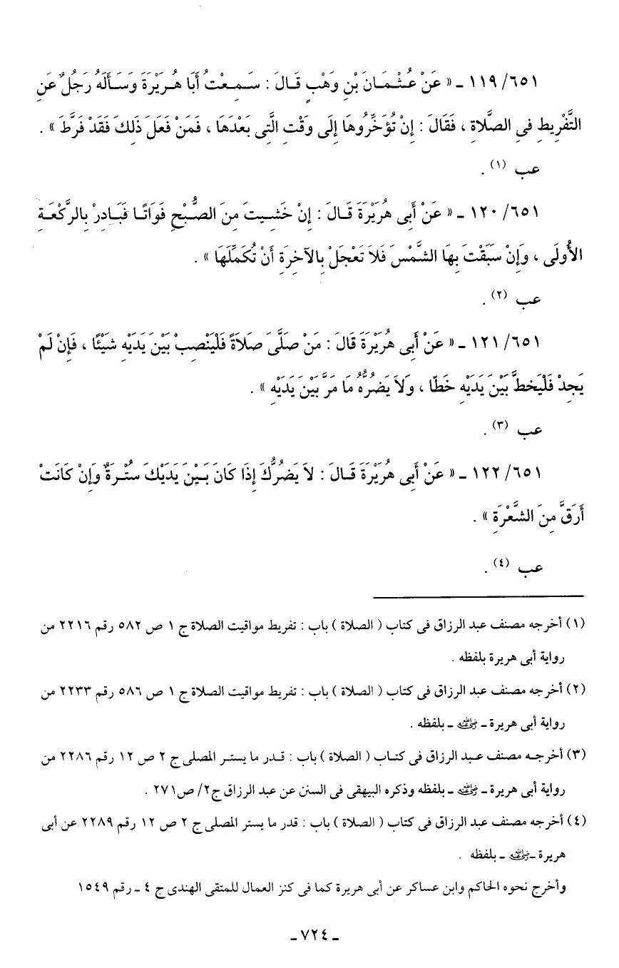 651/ 122 - "عَنْ أَبِى هُرَيْرَةَ قَالَ: لَا يَضُرُّكَ إِذَا كَانَ بَيْنَ يَدَيْكَ سُتْرَةٌ وَإِنْ كَانَتْ أَرَقَ مِنَ الشَّعْرَةِ".