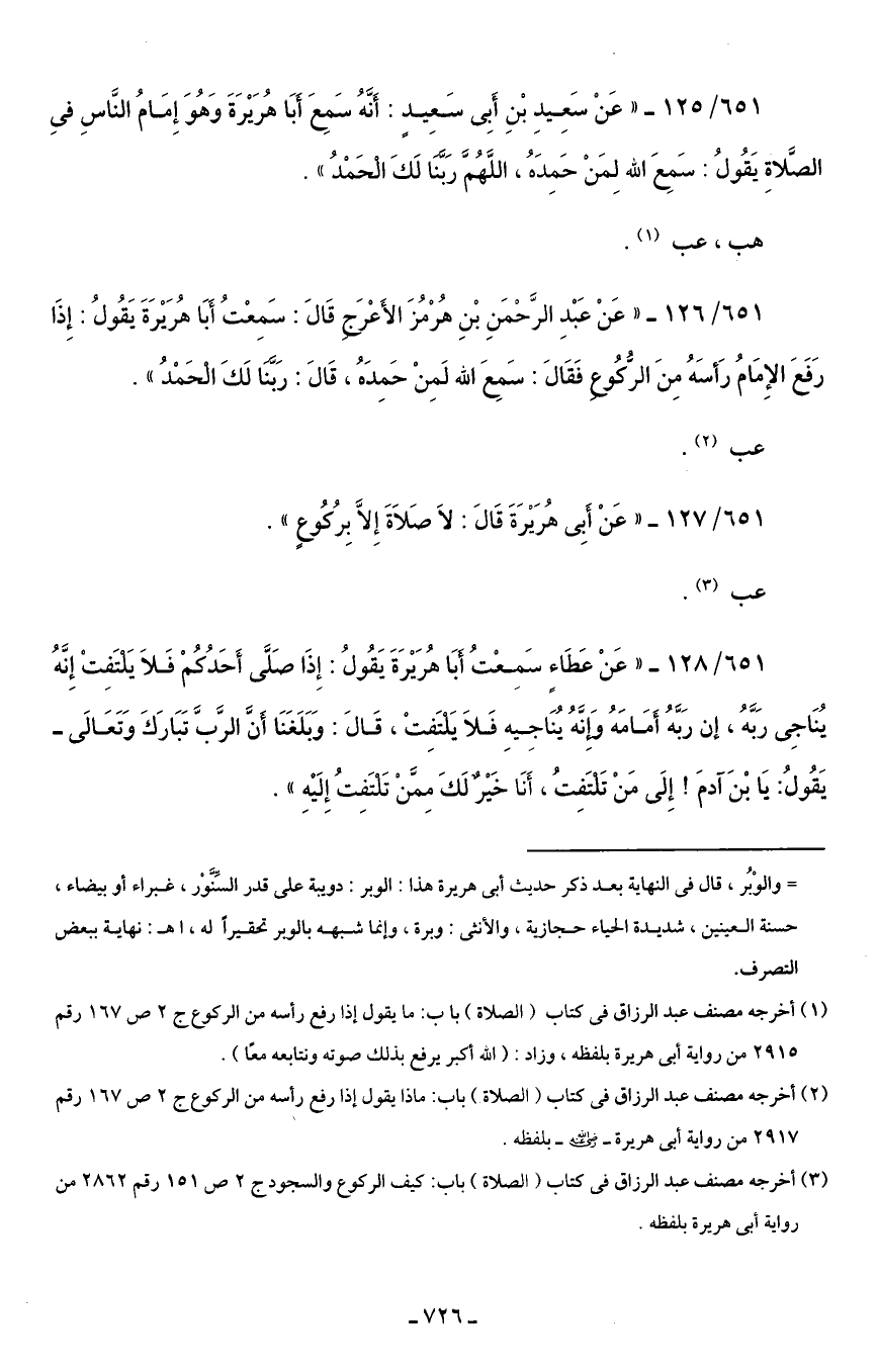 651/ 126 - "عَنْ عَبْدِ الرَّحْمَنِ بْنِ هُرْمُزَ الأَعْرَجِ قَالَ: سَمِعْتُ أَبَا هُرَيْرَةَ يَقُولُ: إِذَا رَفَعَ الإِمَامُ رَأسَهُ مِنَ الركُوع فَقَالَ: سَمِعَ الله لَمِنْ حَمِدَهُ، قَالَ: رَبَّنَا لَكَ الْحَمْدُ".