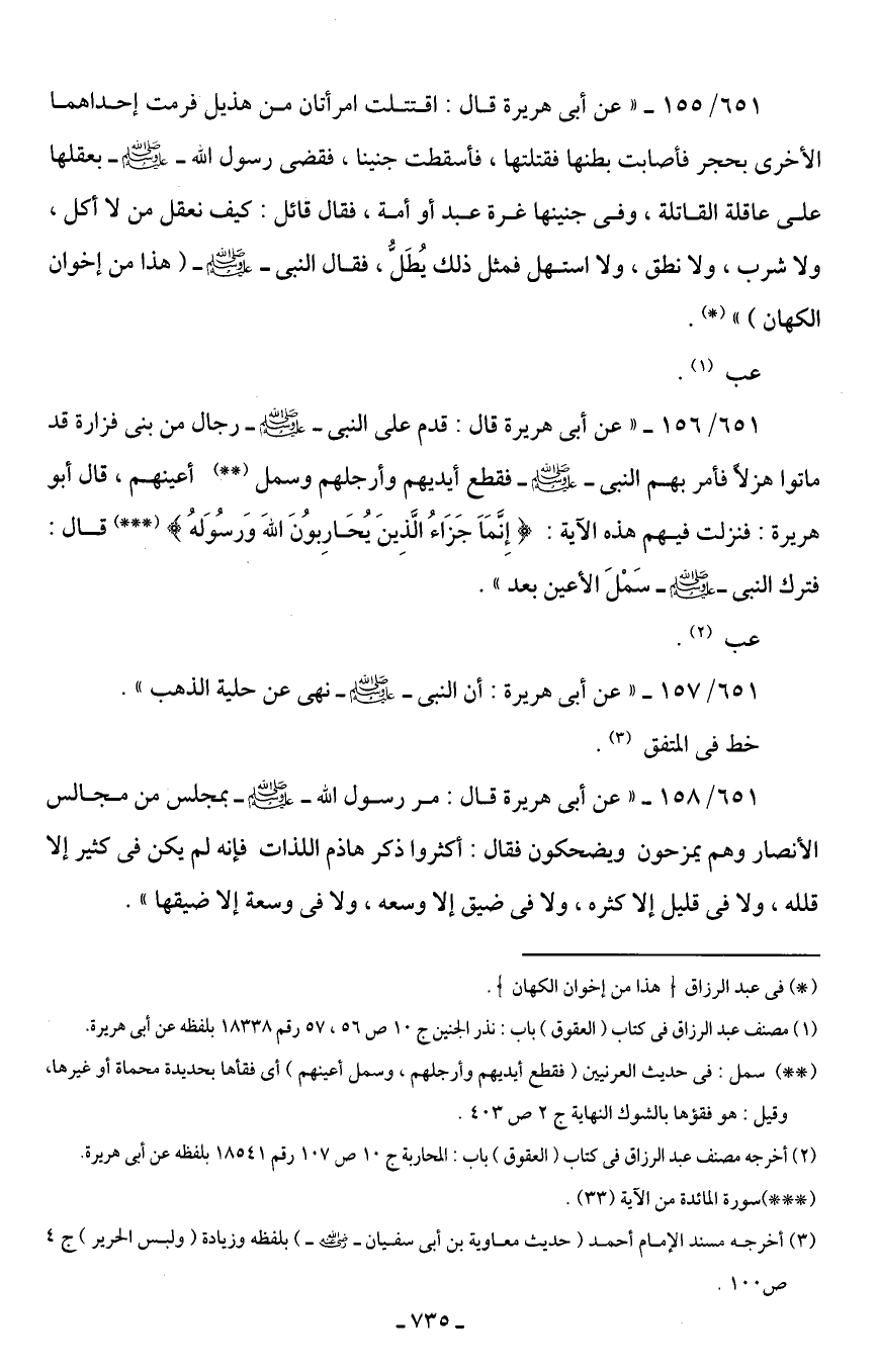651/ 156 - "عن أبى هريرة قال: قدم على النبي - صلى الله عليه وسلم - رجال من بنى فزارة قد ماتوا هزلًا فأمر بهم النبى - صلى الله عليه وسلم - فقطع أيديهم وأرجلهم وسمل (* *) أعينهم، قال أبو هريرة: فنزلت فيهم هذه الآية: {إِنَّمَا جَزَاءُ الَّذِينَ يُحَارِبُونَ اللَّهَ وَرَسُولَهُ} (* * *) قال: فترك النبى - صلى الله عليه وسلم - سَمْلَ الأعين بعد".