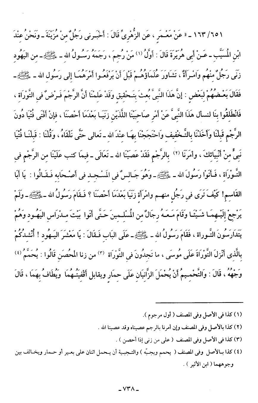 651/ 163 - "عَنْ مَعْمَرٍ، عَن الزُّهرِىِّ قَالَ: أَخْبَرنى رَجُلٌ مِنْ مُزَيْنَةَ -وَنَحْنُ عِنْدَ ابْنِ المُسَيَّبِ- عَنْ أَبِى هُرَيْرَةَ قَالَ: أَوَّلُ (¬1) مَنْ رجمَ، رَجَمَهُ رَسُولُ اللهِ - صلى الله عليه وسلم - مِن اليَهُودِ زَنَى رَجُلٌ مِنْهُم وَامْرَأَةٌ، تَشَاوَرَ عُلَمَاؤهُمْ قَبْلَ أَنْ يَرْفَعُوا أَمْرَهُمَا إِلى رَسُولِ الله - صلى الله عليه وسلم - فَقَالَ بَعْضُهُمْ لِبَعْضٍ: إنَّ هَذَا النَّبِىَّ بُعِثَ بِتَحْقِيقٍ وَقَدْ عَلِمْنَا أَنَّ الرَّجْمَ فَرضٌ في التَّوْرَاةِ، فَانْطَلِقُوا بِنَا لنسأل هَذَا النَّبِىَّ عَنْ أَمْرِ صَاحِبَيْنَا اللَّذَيْنِ زَنَيَا بَعْدَمَا أَحْصَنَا، فِإنْ أَفْتَى فُتْيَا دُونَ الرَّجْمِ قَبِلْنَا وَأخَذْنَا بِالتَّخْفِيفِ وَاحْتَجَجْنَا بِهَا عِنْدَ اللهِ -تَعالى- حَتَّى نَلْقَاهُ، وَقُلْنَا: قَبِلْنَا فُتْيَا نَبِىٍّ مِنْ أَنْبِيَائِكَ، وأمَرَنَا (¬2) بِالرّجْمِ فَقَدْ عَصَيْنَا الله -تَعَالَى- فِيمَا كتب عَلَيْنَا مِن الرَّجْمِ في التَّوْرَاةِ، فَأَتَوْا رَسُولَ الله - صلى الله عليه وسلم - وَهُوَ جَالِسٌ في المَسْجِدِ في أَصْحَابِهِ فَقَالُوا: يَا أَبَا القَاسِم! كَيْفَ تَرَى في رَجُلٍ منهم وامْرَأَةٍ زَنَيَا بَعْدَمَا أَحْصَنَا؟ فَقَامَ رَسُولُ الله - صلى الله عليه وسلم - وَلَمْ يَرْجِعْ إِلَيْهِمَا شَيْئَا وَقَامَ مَعَهُ رِجَالٌ مِن المُسْلِمِينَ حَتَى أَتَوا بَيْتَ مِدْرَاسِ اليَهُودِ وَهُمْ يَتَدَارَسُونَ التَّوراة، فَقَامَ رَسُولُ اللهِ - صلى الله عليه وسلم - عَلَى البَابِ فَقَالَ: يَا مَعْشَرَ اليَهُودِ! أُنشِدُكُمْ بِالَّذِى أَنْزلَ التَّوْرَاةَ عَلَى مُوسَى، ما تَجِدُونَ في التَّوْرَاة (¬3) من زنا الْمُحْصَنِ قَالُوا: يُحَمَّمُ (¬4) وَجْهُهُ، قَالَ: وَالتَّحْمِيمُ أَنْ يُحْمَلَ الزَّانِيَانِ عَلَى حِمَارٍ ويقابل أَقْفِيَتُهُمَا وَيُطَافُ بِهَمَا، قَالَ