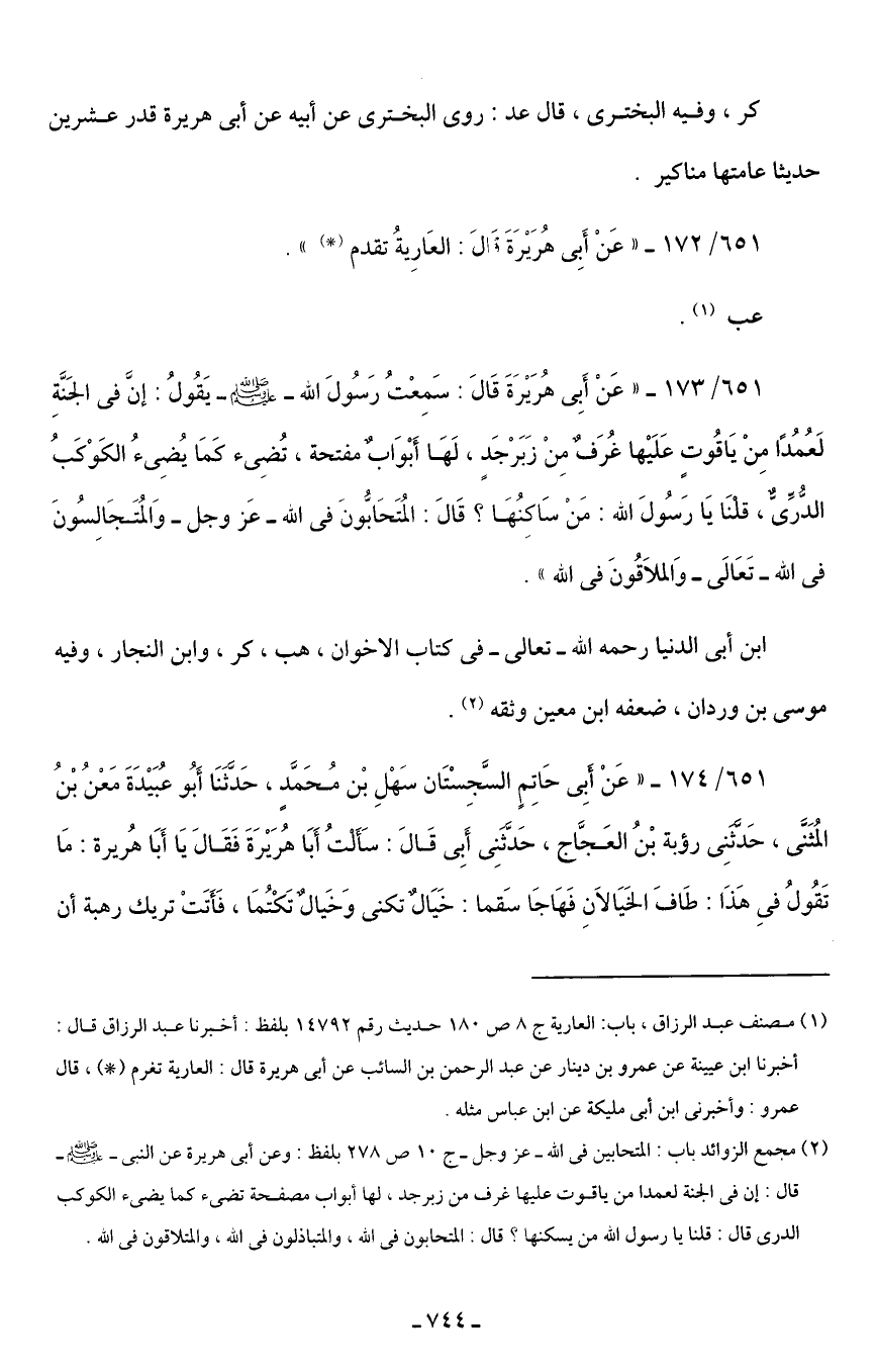 651/ 173 - "عَنْ أَبِى هُرَيْرَةَ قَالَ: سَمِعْتُ رَسُولَ الله - صلى الله عليه وسلم - يَقُولُ: إنَّ في الجَنَّةِ لَعُمُدًا مِنْ يَاقُوتٍ عَلَيْها غُرَفٌ مِنْ زَبَرْجَدٍ، لَهَا أَبْوَابٌ مفتحة، تُضِئ كَمَا يُضِئُ الكَوْكَبُ الدُّرَىٌّ، قلْنَا يَا رَسُولَ الله: مَنْ سَاكنُهَا؟ قَالَ: المُتَحَابُّونَ في الله -عَز وجل- وَالمُتَجَالِسُونَ في الله -تَعَالَى- وَالملَاقُونَ في الله".