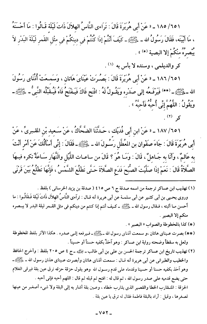 651/ 186 - "عَنْ أَبِى هُرَيْرَةَ قَالَ: بَصُرَتْ عَيْنَاىَ هَاتانِ، وَسَمِعَتْ أُذُنَاى رَسُولَ الله - صلى الله عليه وسلم - (* *) فَيَرْفَعُه إلى صَدْرِهِ وَيَقُولُ لَهُ: افْتَح فَاكَ فَيَفْتَحُ فَاهُ فَيُقبِّلُه النَّبِىُّ - صلى الله عليه وسلم - ويقُولُ: اللَّهُمَّ إِنَى أُحِبُّهُ فَأَحِبَّهُ".