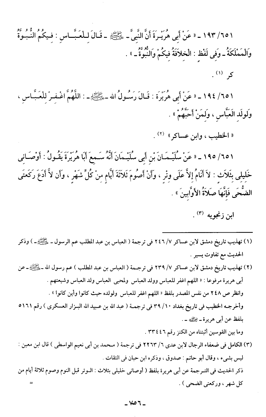 651/ 193 - "عَنْ أَبِى هُرَيْرَةَ أَنَّ النَّبِىَّ - صلى الله عليه وسلم - قَالَ لِلْعَبَّاسِ: فِيكُمُ النُّبُوَّةُ وَالْمَمْلَكَةُ -وَفِى لَفْظٍ: الْخِلَافَةُ فِيكُمْ وَالنُّبُوَّةُ-".
