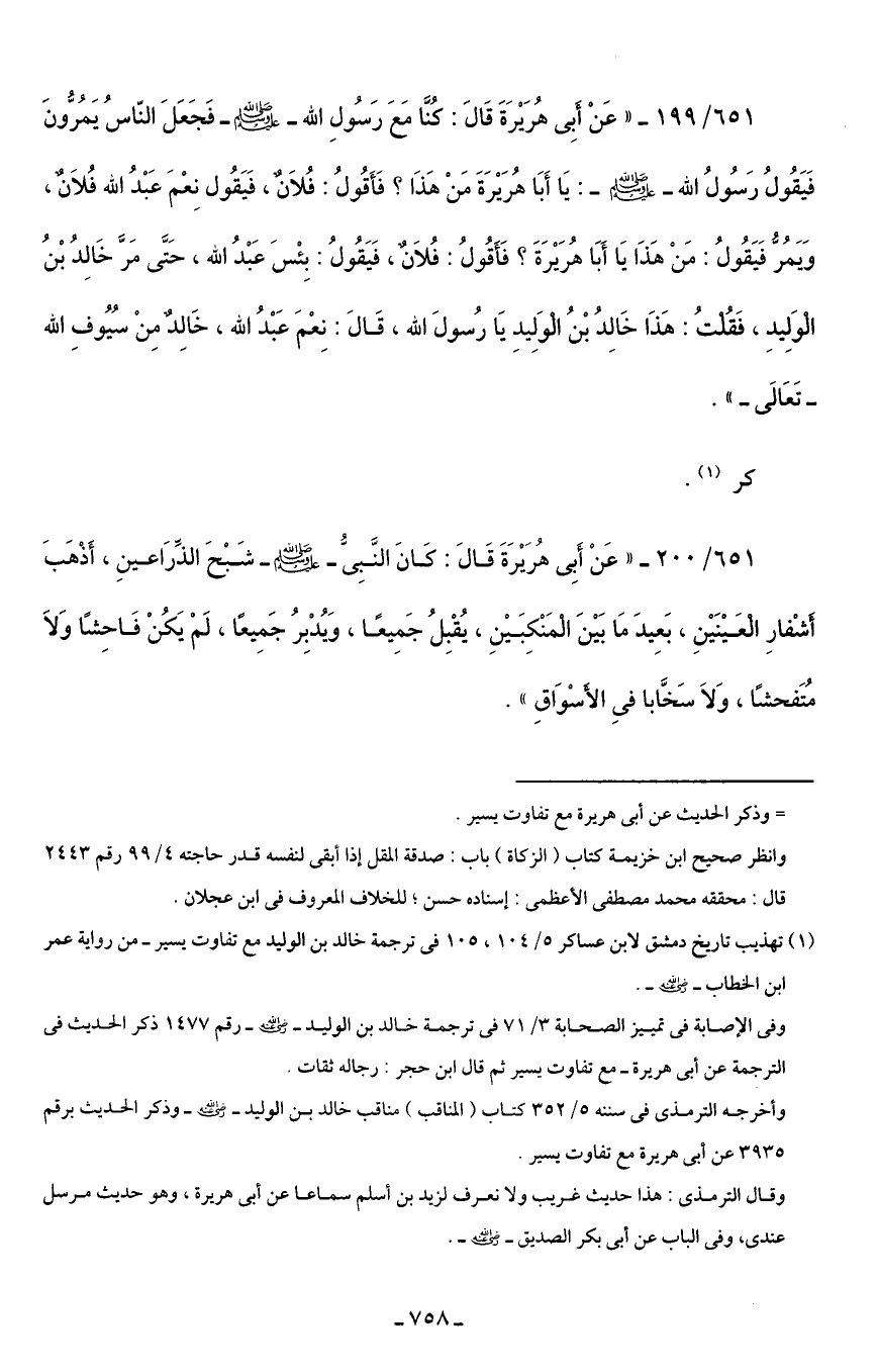 651/ 199 - "عَنْ أبِي هُرَيْرَةَ قَالَ: كنَا مَعَ رَسُولِ الله - صلى الله عليه وسلم - فَجَعَلَ النّاسُ يَمُرُّونَ فَيَقُولُ رَسُولُ الله - صلى الله عليه وسلم -: يَا أَبَا هُرَيْرَةَ مَنْ هَذَا؟ فَأَقُولُ: فُلَانٌ، فَيَقُول نِعْمَ عَبْدُ الله فُلَانٌ، وَيَمُرُّ فَيَقُولُ: مَنْ هَذَا يَا أَبَا هُرَيْرَةَ؟ فَأَقُولُ: فُلَانٌ، فَيَقُولُ: بِئْسَ عَبْدُ الله، حَتَّى مَرَّ خَالِدُ بْنُ الْوَلِيدِ، فَقُلتُ: هَذَا خَالِدُ بْنُ الْوَلِيدِ يَا رُسولَ الله، قَالَ: نِعْمَ عَبْدُ الله، خَالِدٌ مِنْ سُيُوفِ الله -تَعَالَى-".
