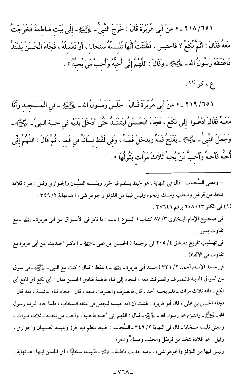 651/ 218 - "عَنْ أَبِى هُرَيْرَةَ قَالَ: خَرَجَ النَّبِيُّ - صلى الله عليه وسلم - إِلَى بَيْتِ فَاطِمَةَ فَخَرَجْتُ مَعهُ فَقَالَ: أثَمَّ لُكَعُ؟ فاحتبس، فَظَنَنْتُ أَنَّهَا تُلْبِسُهُ سخابا، أَوْ تَغْسِلُهُ، فَجَاءَ الْحَسَنُ يَشْتَدُّ فَاعْتَنَقَهُ رَسُولُ الله - صلى الله عليه وسلم - وَقَالَ: اللَّهُمَّ إِنِّى أَحِبُّهُ وَأُحِبُّ مَنْ يُحِبُّهُ".