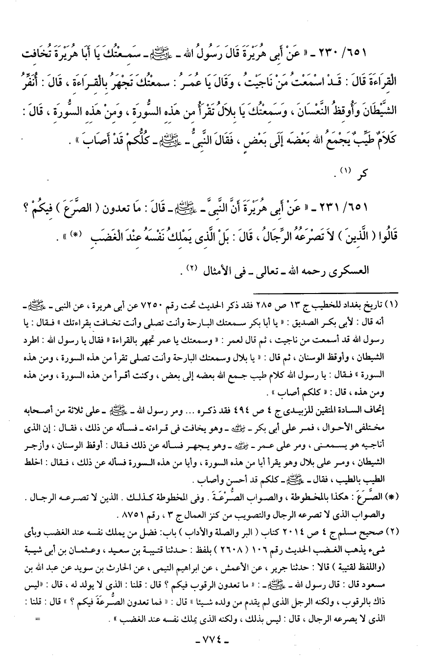 651/ 231 - "عَنْ أبِي هُرَيْرَةَ أنَّ النَّبِىَّ - صلى الله عليه وسلم - قَالَ: مَا تعدون (الصَّرَعَ) فِيكُمْ؟ قَالُوا (الَّذِينَ) لَا تَصْرَعُهُ الرِّجَالُ، قَالَ: بَلْ الَّذِى يَمْلِكُ نَفْسَهُ عِنْدَ الْغَضَبِ (*) ".