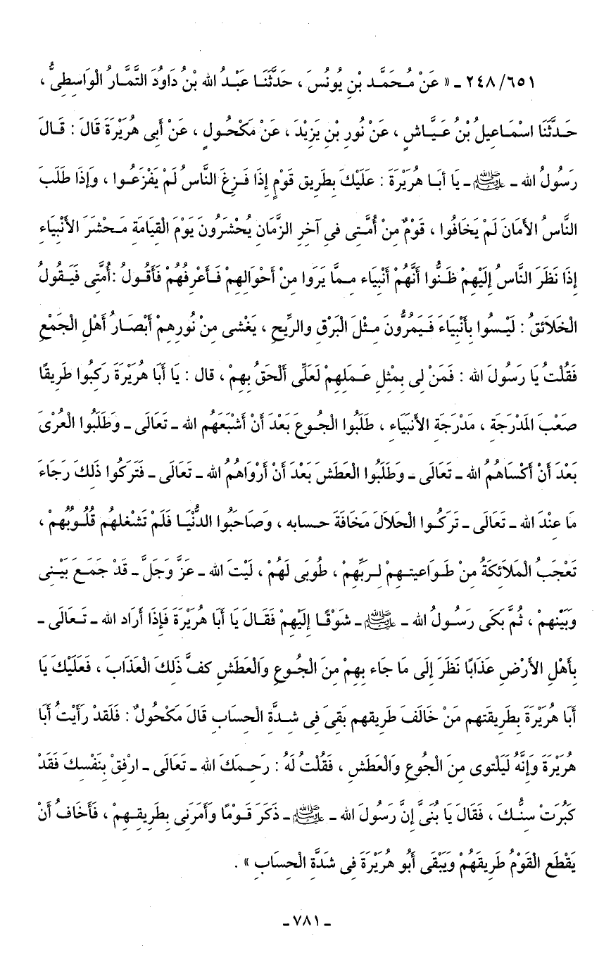 651/ 248 - "عَنْ مُحَمَّد بْنِ يُونُسَ، حَدثَّنَا عَبْدُ الله بْنُ دَاوُدَ التَّمَّارُ الْوَاسِطِيُّ، حَدَّثَنَا إسْمَاعِيلُ بْنُ عَيَّاشٍ، عَنْ نُورِ بْنِ يَزِيْدَ، عَنْ مَكْحُولٍ، عَنْ أبِى هُرَيْرَةَ قَالَ: قَالَ رَسُولُ الله - صلى الله عليه وسلم - يَا أبَا هُرَيْرَةَ: عَلَيْكَ بِطَرِيق قَوْمٍ إِذَا فَزِغَ النَّاسُ لَمْ يَفْزَعُوا، وَإذَا طَلَبَ النَّاسُ الأمَانَ لَمْ يَخَافُوا، قَوْمٌ مِنْ أُمَّتِى في آخِرِ الزَّمَانِ يُحْشَرُونَ يَوْمَ الْقِيَامَةِ مَحْشَرَ الأنْبِيَاءِ إِذَا نَظَرَ النَّاسُ إِلَيْهِمْ ظَنُوا أَنَّهُمْ أَنْبِيَاء مِمَّا يَرَوا مِنْ أَحْوَالِهِمْ فَأَعْرِفُهُمْ فَأَقُولُ: أُمَّتِى فَيَقُولُ الْخَلَائقُ: لَيْسُوا بِأَنْبِيَاءَ فَيَمُرُّونَ مِثْلَ الْبَرْقِ والرِّيح، يَغْشى مِنْ نُورِهِمْ أَبْصَارُ أَهْلِ الْجَمعِ فَقُلتُ يَا رَسُولَ الله: فَمَنْ لِى بِمْثِلِ عَمَلِهِمْ لَعَلِّى أَلْحَقُ بِهِمْ، قال: يَا أَبَا هُرَيْرَةَ رَكِبُوا طَرِيقًا صَعْبَ المَدْرَجَةِ، مَدْرَجَةِ الأنبَيَاءِ، طَلَبُوا الْجُوعَ بَعْدَ أَنْ أَشْبَعَهُم الله -تَعَالَى- وَطَلَبُوا الْعُرْىَ بَعْدَ أَنْ أَكْسَاهُمُ الله -تَعَالَى- وَطَلَبُوا الْعَطَشَ بَعْدَ أَنْ أَرْوَاهُمُ الله -تَعَالَى- فَتَرَكُوا ذَلِكَ رَجَاءَ مَا عِنْدَ الله -تَعَالَى- تَرَكُوا الْحَلَالَ مَخَافَةَ حسابه، وَصَاحَبُوا الدُّنْيَا فَلَمْ تَشْغلهُم قُلُوُبُهمْ، تَعْجَبُ الْمَلَائِكَةُ مِنْ طَوَاعيتهِمْ لِرَبِّهِمْ، طُوبَى لَهُمْ، لَيْتَ الله -عَزَّ وَجَلَّ- قَدْ جَمَعَ بَيْنِى وَبَيْنهمْ، ثُمَّ بَكَى رَسُولُ الله - صلى الله عليه وسلم - شَوْقًا إِلَيْهِمْ فَقَالَ يَا أَبَا هُرَيْرَةَ فَإِذَا أرَاد الله -تَعَالَى- بِأَهْلِ الأرْضِ عَذَابًا نَظَرَ إِلَى مَا جَاء بِهِمْ مِنَ الْجُوع وَالْعَطَشِ كفَّ ذَلِكَ الْعَذَابَ، فَعَلَيْكَ يَا أَبَا هُرَيْرَةَ بِطَرِيقَتهم مَنْ خَالَفَ طَرِيقهم بَقِىَ في شِدَّةِ الْحِسَابِ قَالَ مَكْحُولٌ: فَلَقدْ رَأَيْتُ أَبَا هُرَيْرَةَ وَإِنَّهُ لَيَلْتوى مِنَ الْجُوعِ وَالْعَطَشِ، فَقُلْتُ لَهُ: رَحِمَكَ الله -تَعَالَى- ارْفِقْ بِنَفْسِكَ فَقَدْ كَبُرَتْ سِنُّكَ، فَقَالَ يَا بُنَيَّ إِنَّ رَسُولَ الله - صلى الله عليه وسلم - ذَكَرَ قَوْمًا وَأَمَرَنِى بِطَرِيقِهِمْ، فَأَخَافُ أَنْ يَقْطَع الْقَوْمُ طَرِيقَهُمْ وَيَبْقَى أبُو هُرَيْرَةَ في شَدَّةِ الْحِسَابِ".