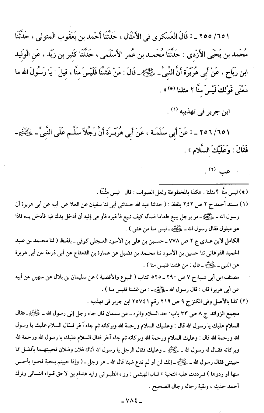 651/ 255 - "قَالَ الْعَسْكرى في الأمْثَال، حَدَّثَنَا أَحْمد بن يَعْقَوب الْمتولى، حَدَّثَنَا مُحَمد بن يَحْيىَ الأَزْدِى: حَدَّثنَا مُحَمد بن عُمر الأَسْلَمى، حَدَّثَنَا كَثِير بن زَيْد، عَنِ الْوَلِيد ابن رَبَاح، عَنْ أبِي هُرَيْرَة أنَّ النَّبِىَّ - صلى الله عليه وسلم - قَالَ: مَنْ غَشَّنَا فَلَيْسَ مِنَّا، قِيلَ: يَا رَسُولَ الله ما مَعْنَى قَوْلكَ لَيْسَ مِنَّا؟ مثلنا (*) ".