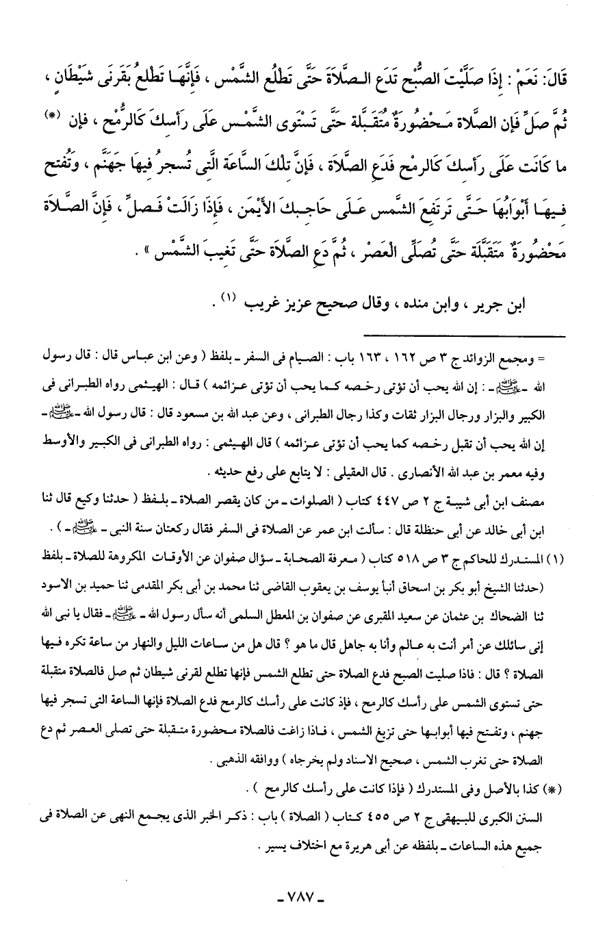 قَالَ: نَعَمْ: إِذَا صَلَّيْتَ الصُّبْح تَدعَ الصَّلَاةَ حَتَّى تَطلُع الشَّمْس، فَإِنَّهَا تَطلعُ بَقَرنَى شَيْطَانٍ، ثُمَّ صَلِّ فَإن الصَّلاة مَحْضُورَةٌ مُتَقَبَّلة حَتَّى تَسْتَوى الشَّمْس عَلَى رَأسِكَ كَالرُّمْح، فإن (*) ما كَانَت عَلَى رَأسِكَ كَالرمْح فَدعَ الصَّلَاة، فَإنَّ تِلكَ السَّاعَة الَّتِى تُسجرُ فِيهَا جَهَنَّم، وَتُفتح فِيهَا أبْوَابُهَا حَتَّى تَرتَفِعَ الشَّمس عَلَى حَاجِبكَ الأيْمَن، فَإِذَا زَالَتْ فَصلِّ، فَإِنَ الصَّلَاة مَحْضُورَةٌ مَتَقَبَّلَة حَتَّى تُصَلِّى الْعَصْر، ثُمَّ دَعِ الصَّلَاة حَتَّى تَغِيبَ الشَّمْس".