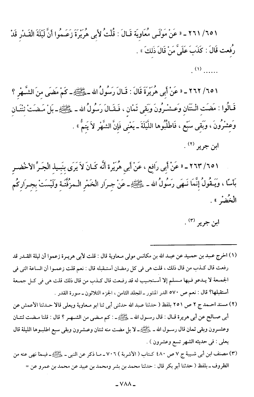 651/ 261 - "عَنْ مَوْلَى مُعَاوِيَة قَالَ: قُلتُ لأَبِى هُرَيْرَةَ زَعَمُوا أَنَّ لَيْلَةَ الْقَدْرِ قَدْ رُفِعت قَالَ: كَذَبَ عَلَىَّ مَنْ قَالَ ذَلِكَ".