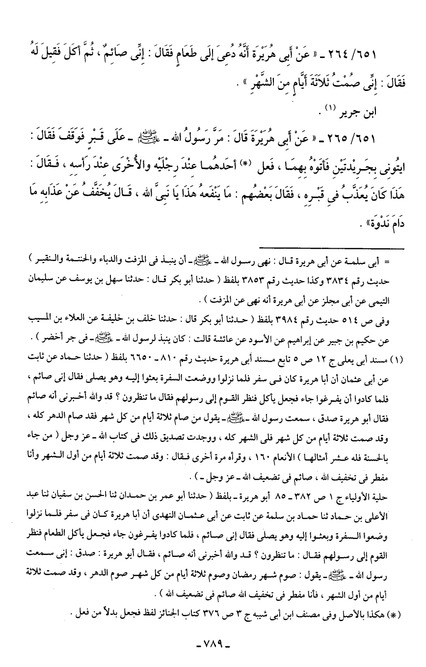 651/ 265 - "عَنْ أَبِى هُرَيْرَةَ قَالَ: مَرَّ رَسُولُ الله - صلى الله عليه وسلم - عَلَى قَبْرٍ فَوَقَف فَقَالَ: ايتُونِى بِجَرِيْدتَيْنِ فَأتَوْهُ بِهِمَا، فَعل (*) أحَدهُما عِنْدَ رِجْلَيْه والأُخْرَى عِنْدَ رَأسِهِ، فَقَالَ: هَذَا كَانَ يُعَذَّبُ فِى قَبْرِهِ، فَقَالَ بَعْضُهم: مَا يَنْفَعهُ هَذَا يَا نَبِىَّ الله، قَالَ يُخَفَّفُ عَنْ عَذَابِهِ مَا دَامَ نَدْوَة".