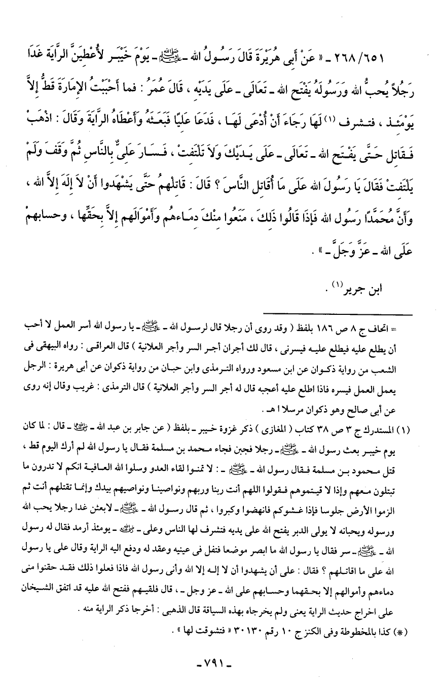651/ 268 - "عَنْ أَبِى هُرَيْرَةَ قَالَ رَسُولُ الله - صلى الله عليه وسلم - يَوْمَ خَيْبَر لَأُعْطِيَنَّ الرَّايَة غَدَا رَجُلًا يُحبُّ الله وَرَسُولَهُ يَفْتَح الله -تَعَالَى- عَلَى يَدَيْهِ، قَالَ عُمَرُ: فما أَحْبَبْتُ الإِمَارَةَ قَطُّ إِلَّا يَوْمَئِذ، فتشرف (*) لَهَا رَجَاءَ أَنْ أُدْعَى لَهَا، فَدَعَا عَلِيًا فَبَعَثَهُ وَأَعْطَاهُ الرَّايَةَ وَقَالَ: اذْهَبْ فَقَاتِل حَتَّى يَفْتَح الله -تَعَالَى- عَلَى يَدَيْكَ وَلَا تَلتَفِتْ، فَسَارَ عَلِىٌّ بِالنَّاسِ ثُمَّ وَقَفَ وَلَمْ يَلتَفِتْ فَقَالَ يَا رَسُولَ الله عَلَى مَا أُقَاتِل النَّاسَ؟ قَالَ: قَاتِلهمُ حَتَّى يَشْهَدوا أَنْ لَا إِلَهَ إِلَّا الله، وَأَنَّ مُحَمَّدًا رَسُول الله فَإذَا قَالُوا ذَلِكَ، مَنَعُوا مِنْكَ دِمَاءهُم وَأَمْوَالَهم إِلَّا بِحَقِّها، وحسابهمْ عَلَى الله -عَزَّ وَجَلَّ-".