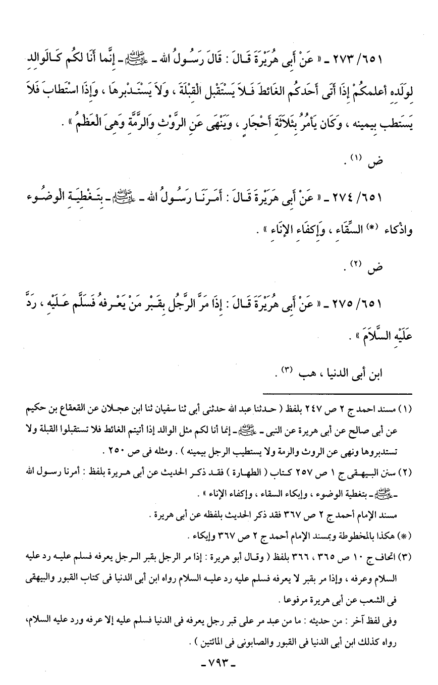 651/ 273 - "عَنْ أَبِى هُرَيْرَةَ قَالَ: قَالَ رَسُولُ الله - صلى الله عليه وسلم - إِنَّما أَنَا لكُم كَالَوالِدِ لِوَلَدِهِ أعلمكُمْ إِذَا أَتَى أَحَدكُم الغَائطَ فَلَا يَسْتَقْبل الْقِبْلَةَ، وَلَا يَسْتَدْبرهَا، وَإِذَا اسْتَطابَ فَلَا يَسَتطب بِيمينه، وَكَان يَأْمُرُ بِثَلَاثَةِ أَحْجَارٍ، وَيَنْهَى عَنِ الرَّوْثِ وَالرَّمَّةِ وَهِيَ الْعَظمُ".