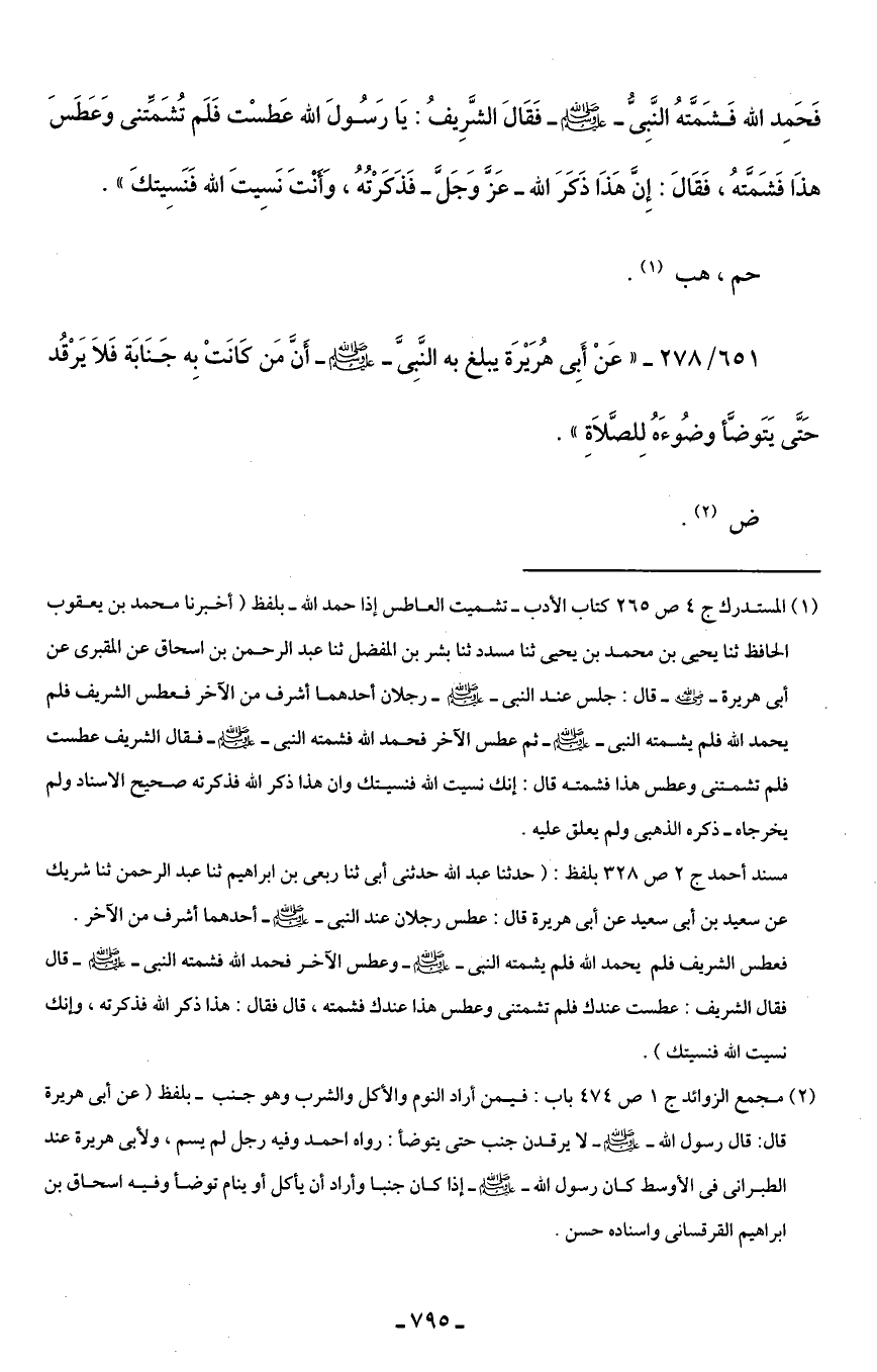 (¬2) مجمع الزوائد ج 1 ص 474 باب: فيمن أراد النوم والأكل والشرب وهو جنب - بلفظ (عن أبى هريرة قال: قال رسول الله - صلى الله عليه وسلم - لا يرقدن جنب حتى يتوضأ: رواه أحمد وفيه رجل لم يسم، ولأبى هريرة عند الطبرانى في الأوسط كان رسول الله - صلى الله عليه وسلم - إذا كان جنبا وأراد أن يأكل أو ينام توضأ وفيه إسحاق بن إبراهيم القرقسانى وإسناده حسن.