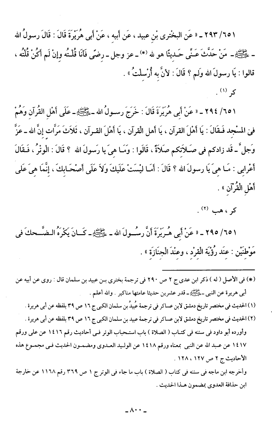 651/ 293 - "عَن البخْترى بْنِ عبيد، عَن أَبيهِ، عَنْ أَبى هُرَيْرَةَ قَالَ: قَالَ رسولُ الله - صلى الله عليه وسلم - مَنْ حَدَّثَ عَنِّى حَدِيثًا هو لله (*) -عَزَّ وَجَلَّ- رِضًى فَأنَا قُلتُه وإنْ لَم أَكُنْ قُلتُه، قالوا: يَا رسولَ الله وَلم؟ قَالَ: لأنَّ بِه أُرْسِلتُ".