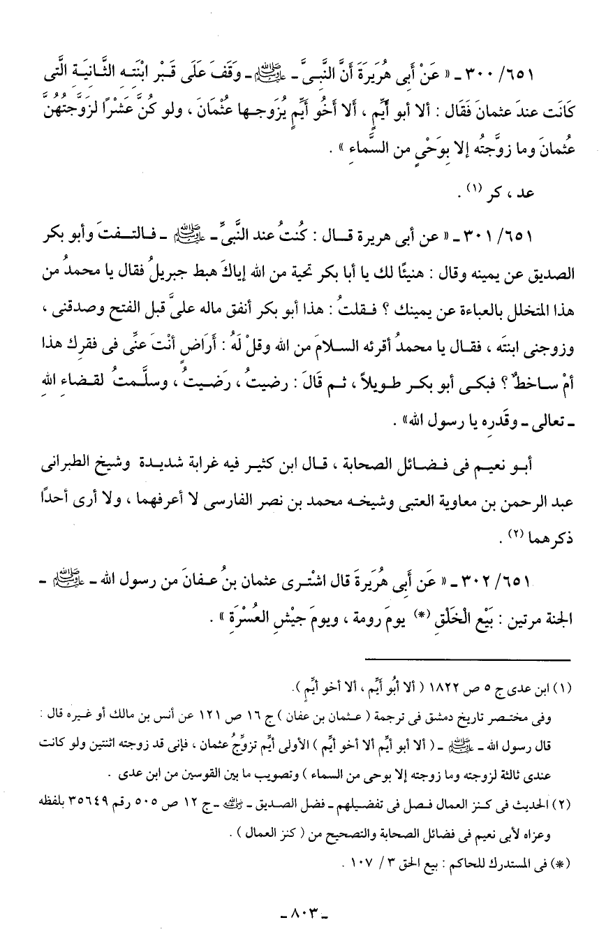 651/ 300 - "عَنْ أَبِى هُرَيرَةَ أَنَّ النَّبِىَّ - صلى الله عليه وسلم - وَقَفَ عَلَى قَبْر ابْنَتِهِ الثَّانِيَةِ الَّتى كَانَت عندَ عثمانَ فَقَال: ألا أبو أَيِّمٍ، أَلا أَخُو أَيِّمٍ يُزَوجها عُثْمَانَ، ولو كُنَّ عَشْرًا لزَوَّجتُهُنَّ عُثمانَ وما زوَّجتُه إلا بِوَحْىٍ من السَّماءِ".