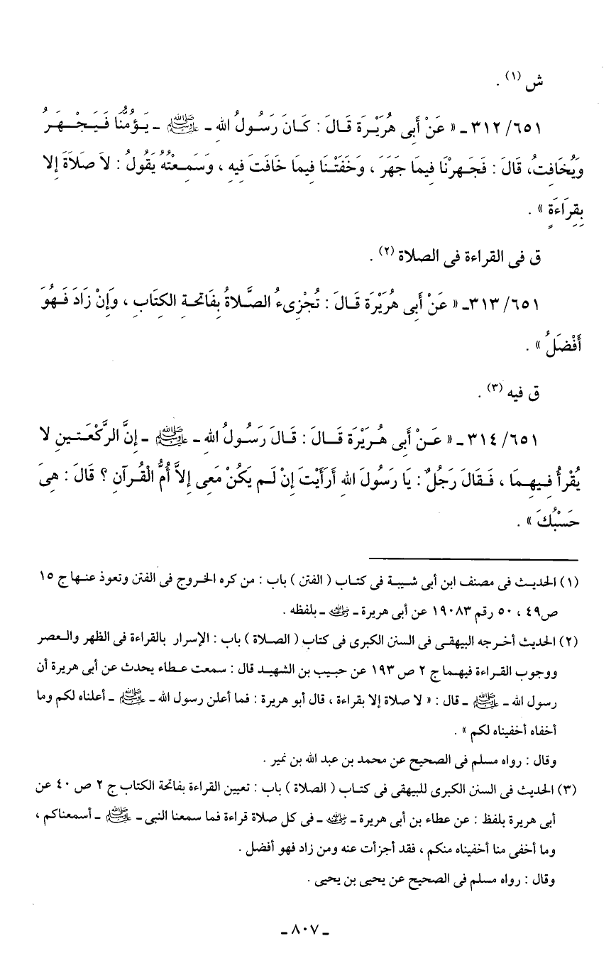 651/ 312 - "عَنْ أَبِى هُرَيْرَة قَالَ: كَانَ رَسُولُ اللهِ - صلى الله عليه وسلم - يَؤُمُّنَا فَيَجْهَرُ وَيُخَافِتُ، قَالَ: فَجَهرْنَا فِيمَا جَهَرَ، وَخَفَتْنَا فِيمَا خَافَتَ فِيهِ، وَسَمِعْتُهُ يَقُولُ: لَا صَلَاةَ إِلا بِقِرَاءَةٍ".