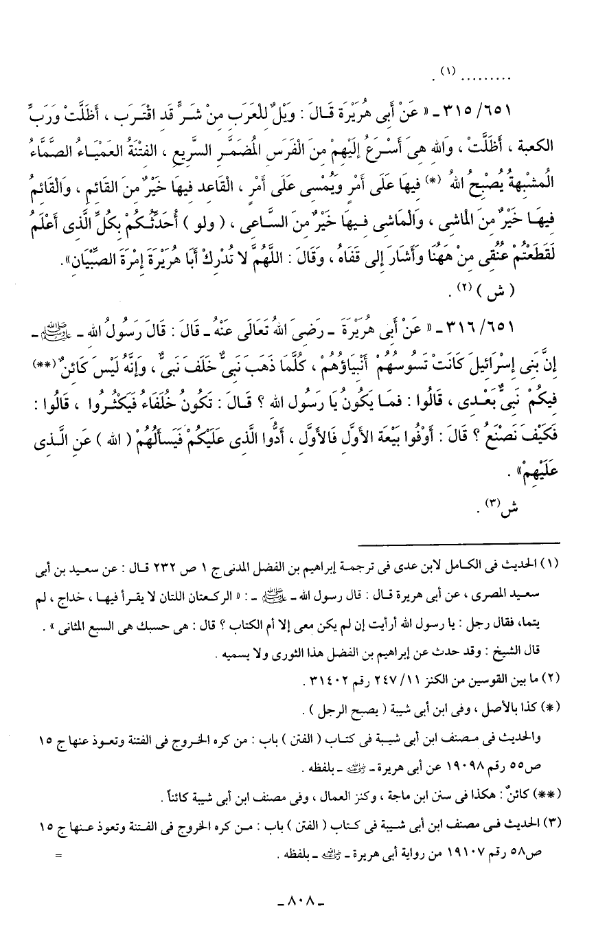 651/ 315 - "عَنْ أَبِى هُرَيْرَة قَالَ: وَيْلٌ للعَرَبِ مِنْ شَرٍّ قَدِ اقْتَرَب، أَظَلَّتْ وَرَبِّ الكعبة، أَظَلَّتْ، وَاللهِ هِىَ أَسْرعُ إِلَيهِمْ مِنَ الْفَرَسِ المُضَمَّرِ السَّرِيعِ، الفِتْنَةُ العَمْيَاءُ الصَّمَّاءُ المشْبِهةُ يُصْبِحُ اللهُ (*) فِيهَا عَلَى أَمْرٍ وَيُمْسِى عَلَى أَمْرٍ، الْقَاعِد فِيهَا خَيْرٌ مِنَ القَائِم، وَالْقَائِمُ فِيهَا خَيْر مِنَ الْماشِى، وَالْمَاشِى فِيهَا خَيْرٌ مِنَ السَّاعِى، (ولو) أُحَدِّثُكُمْ بِكُلِّ الَّذِى أَعْلَمُ لَقَطَعْتُمْ عُنُقِى مِنْ هَهُنَا وَأَشَارَ إِلى قَفَاهُ، وَقَالَ: اللَّهُمَّ لا تُدْرِكْ أَبَا هُرَيْرَةَ إِمْرَةَ الصِّبْيَانِ".