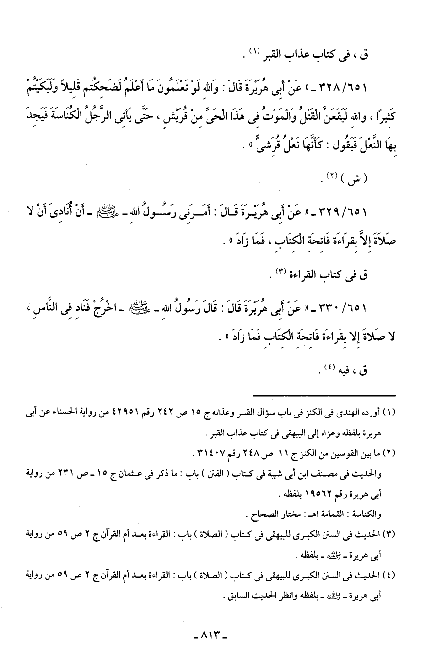 651/ 330 - "عَنْ أَبِى هُرَيْرَةَ قَالَ: قَالَ رَسُولُ اللهِ - صلى الله عليه وسلم - اخْرُجْ فَنَادِ فِى النَّاسِ، لا صَلاةَ إِلا بِقَراءَة فَاتِحَةِ الْكِتَابِ فَمَا زَادَ".